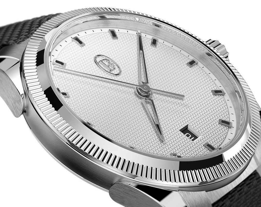 Часы Parmigiani Fleurier Tonda PF Sport Automatic представлены в корпусе размером 41 х 9.8 мм из нержавеющей стали водонепроницаемостью 100 метров. Внутри корпуса установлен автоматический механизм, Калибр PF770, обладающий запасом хода 60 часов. На серебристом гильошированном циферблате отображаются часы, минуты, секунды, дата. Часы поставляются на каучуковом ремешке с застежкой из нержавеющей стали.