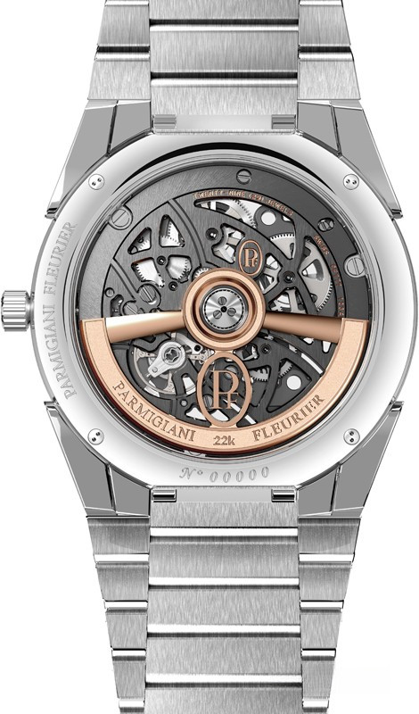 Часы Parmigiani Fleurier Tonda Skeleton представлены в корпусе из нержавеющей стали размером 40 х 8.5 мм водонепроницаемостью 100 метров. Внутри корпуса установлен автоматический механизм, Калибр PF777, обладающий запасом хода 60 часов. На сером скелетированном циферблате отображаются часы, минуты. Часы комплектуются браслетом из нержавеющей стали.