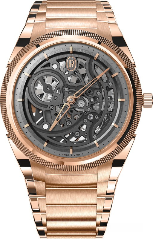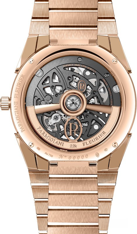 Часы Parmigiani Fleurier Tonda Skeleton представлены в корпусе из розового золота 18к размером 40 х 8.5 мм водонепроницаемостью 100 метров. Внутри корпуса установлен автоматический механизм, Калибр PF777, обладающий запасом хода 60 часов. На сером скелетированном циферблате отображаются часы, минуты. Часы комплектуются браслетом из розового золота 18к.