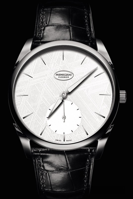 Циферблат новой модели Tonda 1950 от Parmigiani Fleurier из белого метеорита. Корпус размером 39 х 7.97 мм изготовлен из титана. Ультраплоская конструкция калибра PF 702 достигается за счет оригинального платинового микроротора, встроенного в часовой механизм. Толщина составляет всего 2,6 мм, что стало настоящим прорывом в часовом производстве. Декоративная отделка часового механизма Tonda 1950 выполнена с особой тщательностью, которой славится часовая мануфактура Parmigiani Fleurier. Все детали часового механизма и корпуса часов Tonda 1950 создаются на мануфактуре, с исключительной заботой и желанием доказать, что каждый Калибр марки соответствует самым высоким стандартам качества.