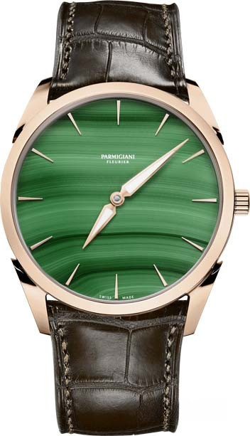 Циферблат новой модели Tonda 1950 от Parmigiani Fleurier зеленого цвета. Корпус размером 39 х 8.4 мм изготовлен из розового золота 18к. Ультраплоская конструкция калибра PF 702 достигается за счет оригинального платинового микроротора, встроенного в часовой механизм. Толщина составляет всего 2,6 мм, что стало настоящим прорывом в часовом производстве. Декоративная отделка часового механизма Tonda 1950 выполнена с особой тщательностью, которой славится часовая мануфактура Parmigiani Fleurier. Все детали часового механизма и корпуса часов Tonda 1950 создаются на мануфактуре, с исключительной заботой и желанием доказать, что каждый Калибр марки соответствует самым высоким стандартам качества.