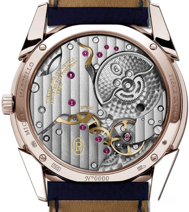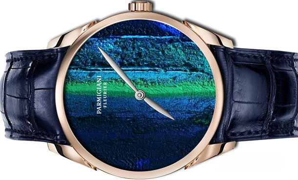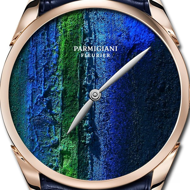 Часы Parmigiani Fleurier Tonda 1950 Marcello Lo Giudice выпущены в корпусе из розового золота 18к размером 39 мм и водонепроницаемостью 30 м. Внутри корпуса установлен автоматический механизм, Калибр PF702. На синем с зеленым циферблате отображаются часы, минуты. Запас хода 48 часов. Часы комплектуются ремешком из кожи аллигатора с вставкой из розового золота 18к. Серия ограничена - 12 шт.