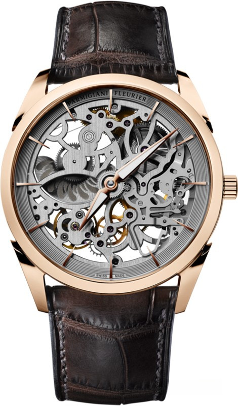 Parmigiani Tonda 1950 Squelette имеет открытый скелетонизированный циферблат. Parmigiani со знанием дела скелетонизировали мануфактурный Калибр PF705 на современный и привлекательный манер. Калибр PF705 имеет толщину всего 2.6 мм (весь корпус имеет толщину 7.8 мм) и состоит из 144 деталей. Он работает с частотой 21 600 пк/час (3 Гц) и имеет запас хода 42 часа. Для этих моделей Parmigiani Tonda 1950 Squelette мануфактура решила убрать вспомогательные секундные индикаторы и оставить только часовую и минутную стрелки. Часы комплектуются ремешком из кожи аллигатора с золотой застежкой. Корпус размером 39 х 7.8 мм изготовлен из розового золота 18к.
