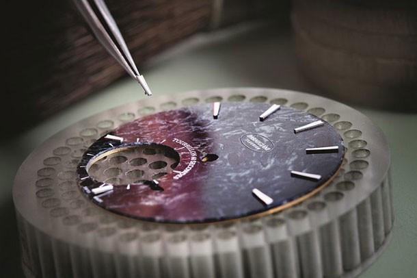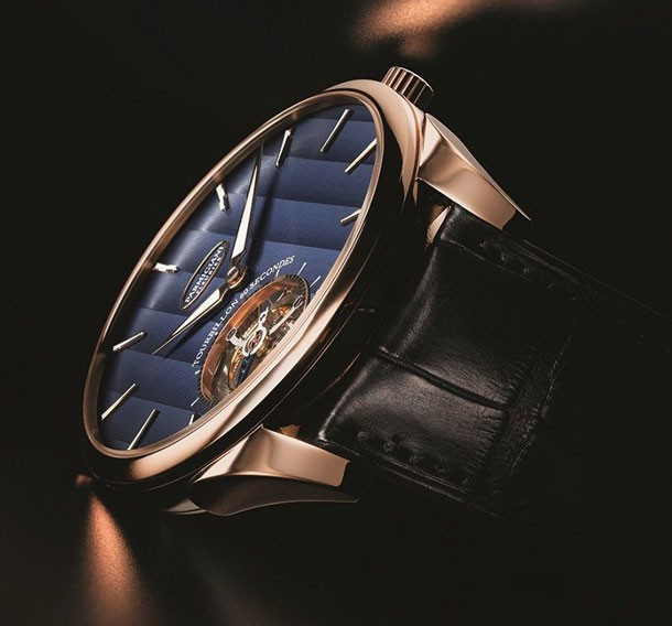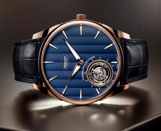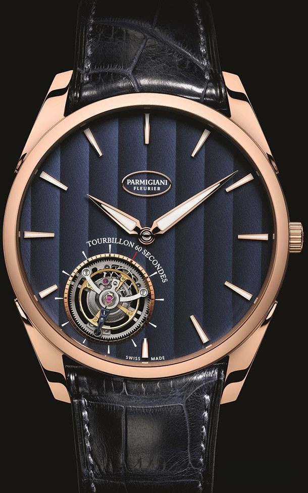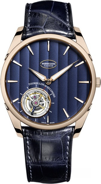 Часы Parmigiani Tonda 1950 Tourbillon оснащены самым тонким автоматическим часовым механизмом с микро-ротором и парящим турбийоном. Parmigiani – компания вертикально структурирована, с собственными мануфактурами часовых механизмов (Vaucher, совместно с Hermès), циферблатов (Quadrance et Habillage), корпусов (Les Artisans Boîtiers), а также Atokalpa для всех компонентов спускового механизма, включая балансовую пружину, и поставкой ремешков от Hermès. Это означает, что компания располагает широкой артистической свободой, и коллекция ярко демонстрирует полное использование этих возможностей. Модель с синим гильошированным циферблатом имеет гладкие, конические индексы. Корпус изготовлен из розового золота 18к, его размер составляет 40.2 х 8.65 мм, водонепроницаемость до 30 метров. Часы комплектуются синим ремешком из кожи аллигатора.
