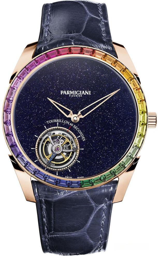 Часы Parmigiani Tonda 1950 Tourbillon оснащены самым тонким автоматическим часовым механизмом с микро-ротором и парящим турбийоном. Parmigiani – компания вертикально структурирована, с собственными мануфактурами часовых механизмов (Vaucher, совместно с Hermès), циферблатов (Quadrance et Habillage), корпусов (Les Artisans Boîtiers), а также Atokalpa для всех компонентов спускового механизма, включая балансовую пружину, и поставкой ремешков от Hermès. Это означает, что компания располагает широкой артистической свободой, и коллекция ярко демонстрирует полное использование этих возможностей. Модель с синим циферблатом из авантюрина. Корпус изготовлен из розового золота 18к, его размер составляет 40.2 х 9.4 мм, водонепроницаемость до 30 метров. Часы комплектуются синим ремешком из кожи аллигатора. Безель из разноцветных багетных сапфиров.