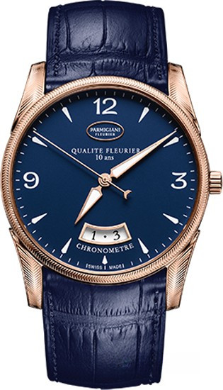 Часы Parmigiani Fleurier Tonda 39 QF выпущены в корпусе из розового золота 18к размером 39 х 8.85 мм и водонепроницаемостью 30 м. Внутри корпуса установлен автоматический, Калибр PF331QF с запасом хода 55 часов, механизм сертифицирован в качестве хронометра COSC. На синем циферблате отображаются часы, минуты, секунды, дата. Часы комплектуются ремешком из кожи аллигатора с вставкой из розового золота 18к.