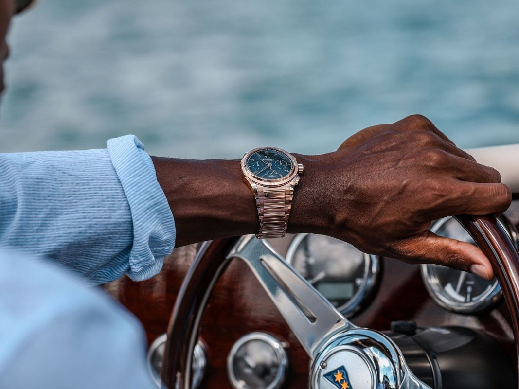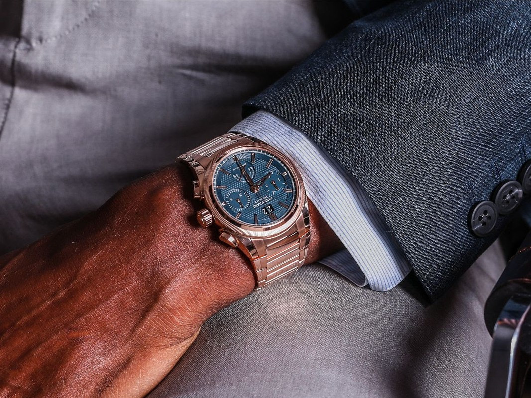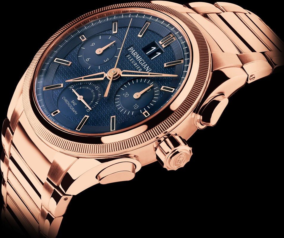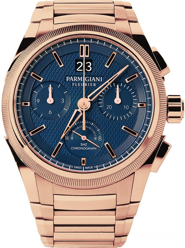 Часы Parmigiani Fleurier Tondagraphe GT представлены в корпусе размером 42 х 14.3 мм из розового золота 18к с водонепроницаемостью 100 метров. Внутри корпуса установлен автоматический механизм, Калибр PF071, обладающий запасом хода 65 часов. На синем гильошированном циферблате отображаются часы, минуты, секунды, дата. Часы поставляются на золотом браслете. Серия ограничена - 25 шт.