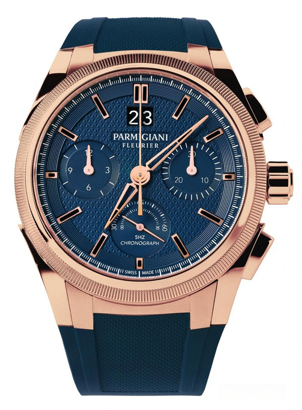 Часы Parmigiani Fleurier Tondagraphe GT представлены в корпусе размером 42 х 14.3 мм из розового золота 18к с водонепроницаемостью 100 метров. Внутри корпуса установлен автоматический механизм, Калибр PF071, обладающий запасом хода 65 часов. На синем гильошированном циферблате отображаются часы, минуты, секунды, дата. Часы поставляются на каучуковом ремешке с вставкой из розового золота 18к. Серия ограничена - 25 шт.