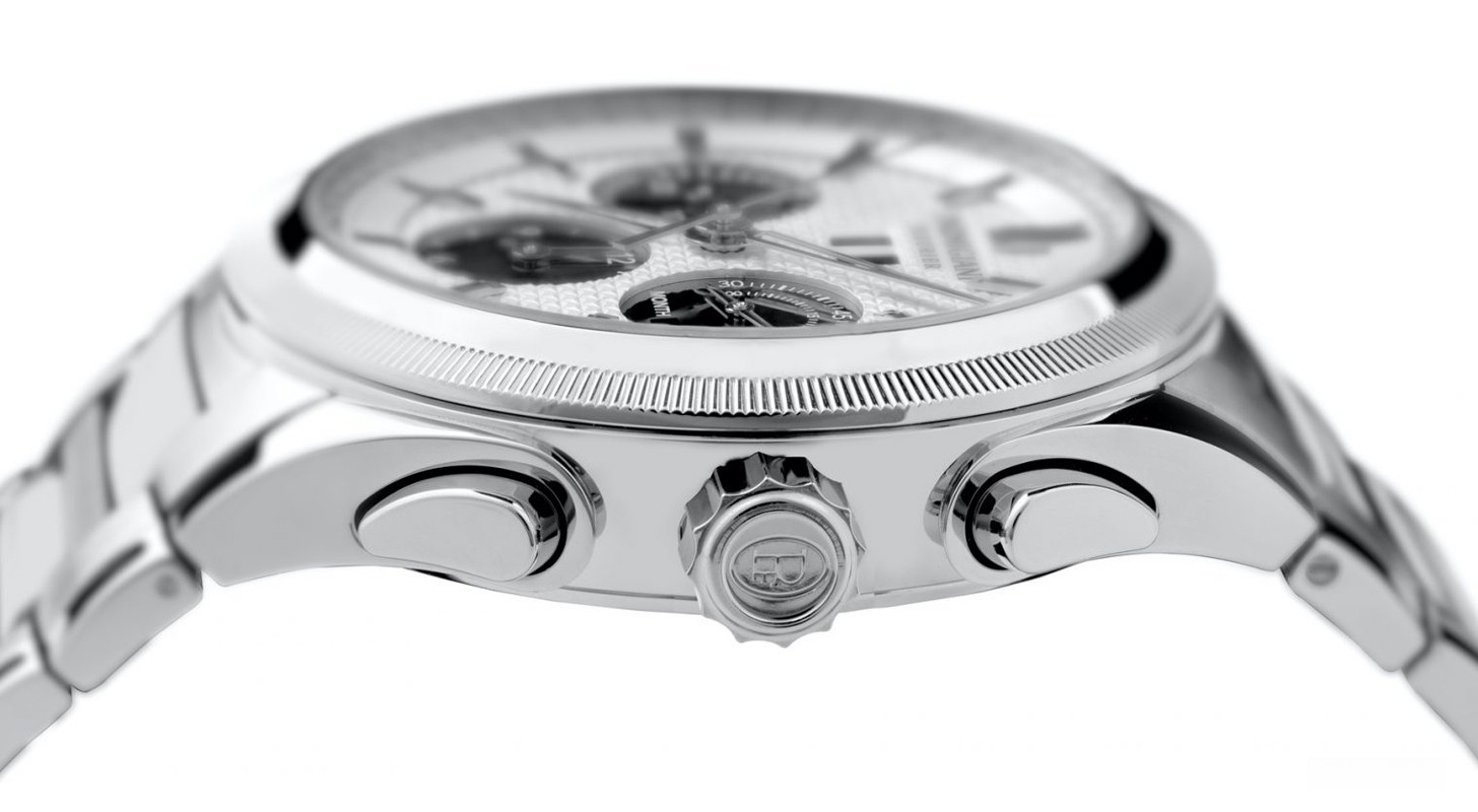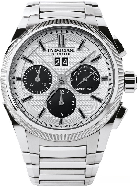 Часы Parmigiani Fleurier Tondagraphe GT представлены в корпусе размером 42 х 13.7 мм из нержавеющей стали с водонепроницаемостью 100 метров. Внутри корпуса установлен автоматический механизм, Калибр PF043, обладающий запасом хода 48 часов. На белом с черным гильошированном циферблате отображаются часы, минуты, секунды, дата. Часы поставляются на браслете из нержавеющей стали.