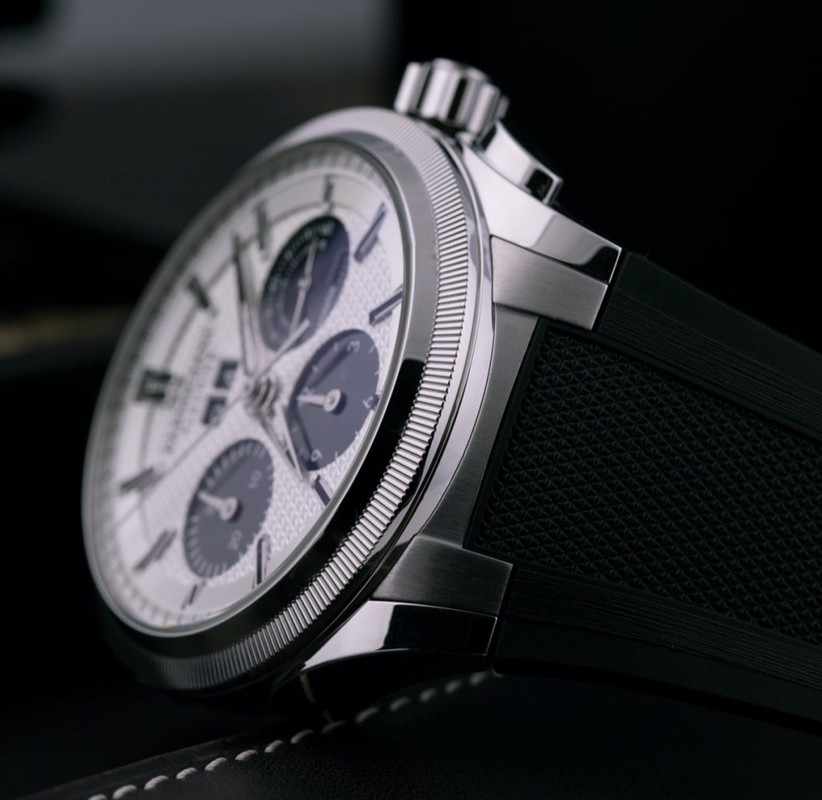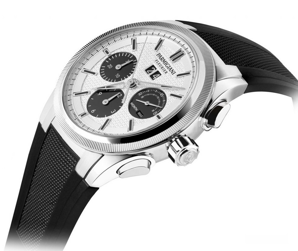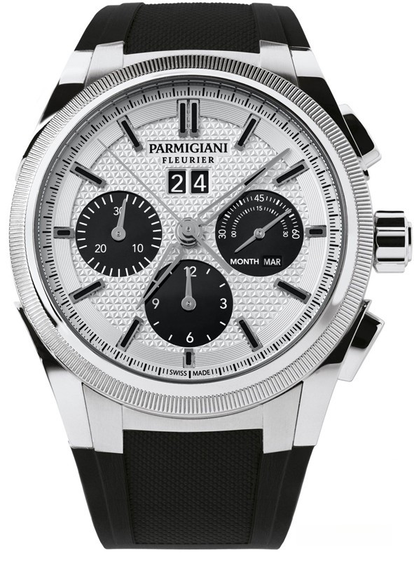 Часы Parmigiani Fleurier Tondagraphe GT представлены в корпусе размером 42 х 13.7 мм из нержавеющей стали с водонепроницаемостью 100 метров. Внутри корпуса установлен автоматический механизм, Калибр PF043, обладающий запасом хода 48 часов. На белом с черным гильошированном циферблате отображаются часы, минуты, секунды, дата. Часы поставляются на каучуковом ремешке с вставкой из нержавеющей стали.