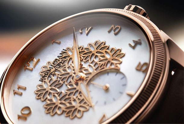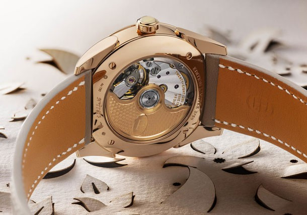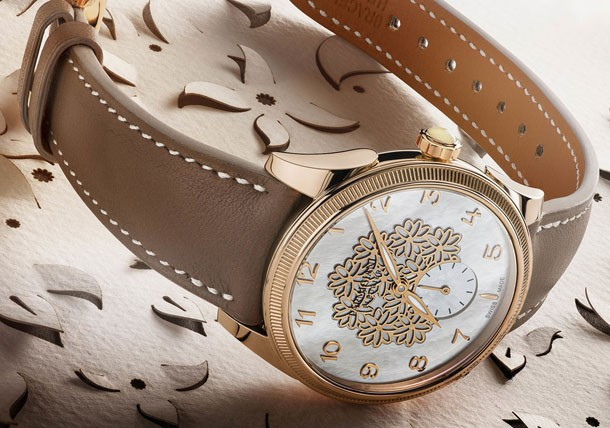 Новый Toric Fleur, представленный в корпусе из розового золота, отличается изысканным кружевным рисунком маргаритки на циферблате. На белом перламутровом циферблате нанесены арабские цифры, а изящный дизайн с золотыми кружевами напоминает маргаритку, украшающую швейцарские долины весной. Управляемые автоматическим Калибром PF310, стрелки в форме листьев с люминесцентным материалом, еще одна дань природе, показывают часы и минуты. Маленькая секундная стрелка находится на шести часах. Задняя крышка обеспечивает захватывающее зрелище, мосты покрыты женевскими волнами, а на золотом роторе деликатно выгравирован мотив ячменного зерна. Белый опаловый кабошон украшает коронку этих часов, которая сочетается с кожаным ремешком Hermès.