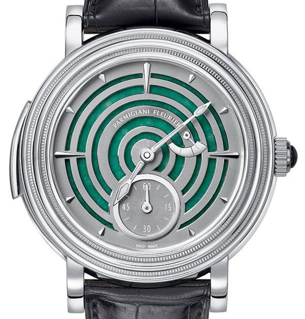 Часы Parmigiani Fleurier Tonda Quaestor представлены в корпусе из платины 950 размером 46 х 13.2 мм. Внутри корпуса находится механизм с ручным заводом, Калибр PF357. Запас хода составляет 72 часа. На серебристом с зеленым бирманским нефритом циферблате отображаются часы, минуты, секунды, запас хода. Часы комплектуются черным ремешком из кожи аллигатора с вставкой из белого золота 18к. Водонепроницаемость составляет 10 метров. Серия ограничена 5 шт.