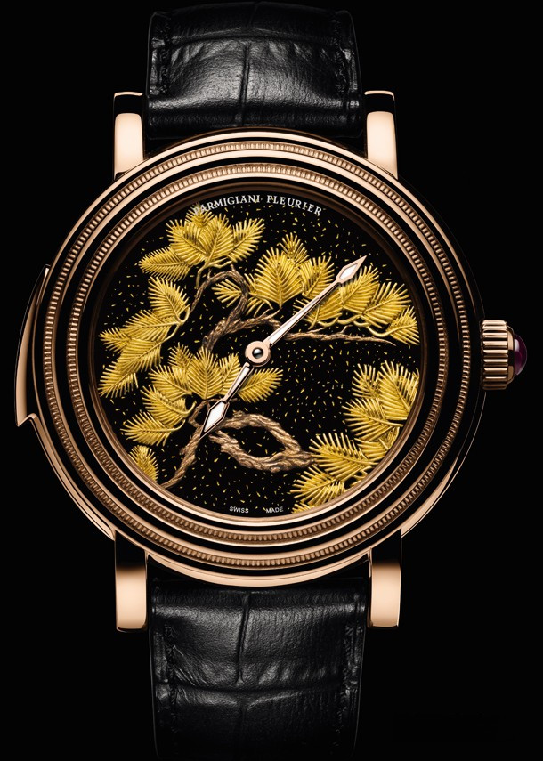 Сосна является одним из важнейших символов в традиционной японской культуре. Ее вечнозеленые иголки символизируют силу, жизненную энергию и бессмертие. Считается, что она приносит удачу. В честь этого общепризнанного символа компания Parmigiani Fleurier решила создать в рамках своей коллекции Toric уникальную модель с часовым усложнением. Искривленные стволы и узловатые ветви сосны на циферблате часов воспроизведены с особой тщательностью, вплоть до каждой иголочки. Все элементы рисунка на циферблате представлены в виде накладных деталей. Перламутровый циферблат глубокого черного цвета, материал которого добыт из раковины моллюска Атрина, контрастирует с озаряемым светом рисунком сосны. В довершение перламутровый циферблат частично покрыт порошком из золота 999-й пробы. Так циферблат приобретает дополнительный внутренний свет и буквально оживает. А стрелки часов с люминесцентным покрытием типичной для марки Parmigiani Fleurier копьевидной формы продолжают бесшумно скользить над циферблатом. Заводную головку украшает рубиновый кабошон, который делит своие сияние с часовым корпусом из розового золота. Черный ремешок для этой уникальной модели выполнен маркой Hermès из кожи аллигатора. Корпус из розового золота изготовлен так, чтобы бой минутного репетира приобрел наилучшие акустические характеристики, позволяя звуковым волнам вибрировать в его сердце на оптимальных частотах.