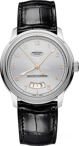 Часы Parmigiani Fleurier Toric Qualite Fleurier представлены в корпусе размером 40.8 х 9.5 мм из белого золота 18к с водонепроницаемостью до 30 метров. Внутри корпуса установлен автоматический механизм, Калибр PF331-QF, обладающий запасом хода 55 часов. На серебристом гильошированном циферблате отображаются часы, минуты, секунды, дата. Часы поставляются на ремешке из кожи аллигатора с вставкой из белого золота 18к.