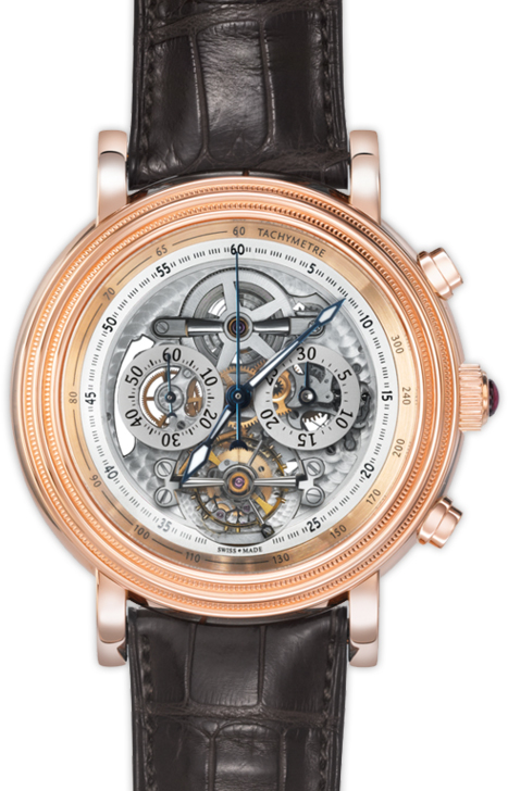 Часы Parmigiani Fleurier Toric Tourbillon представлены в корпусе из розового золота 18к размером 44 х 12.4 мм. Внутри корпуса находится механизм с ручным заводом, Калибр PF354. Запас хода составляет 72 часа. На серебристом циферблате отображаются часы, минуты, секунды, тахиметр. Часы комплектуются коричневым ремешком из кожи аллигатора с вставкой из розового золота 18к. Водонепроницаемость составляет 30 метров. Серия ограничена.