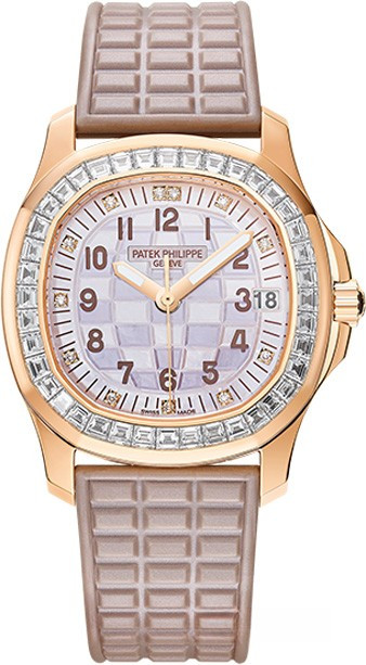Водостойкие часы Patek Philippe Aquanaut 5072 5072R-001 выпущены в круглом корпусе из розового золота 18к. Размер составляет 35,6 мм, водонепроницаемость до 120 м с безелем из 40-а белых багетных бриллиантов. Внутри корпуса установлен автоматический механизм, обеспечивающий запас хода 45 часов. На фиолетовом жемчужном циферблате с 12-ю белыми бриллиантами отображаются часы, минуты, секунды, дата. Часы комплектуются каучуковым ремешком с вставкой из розового золота, 18к.