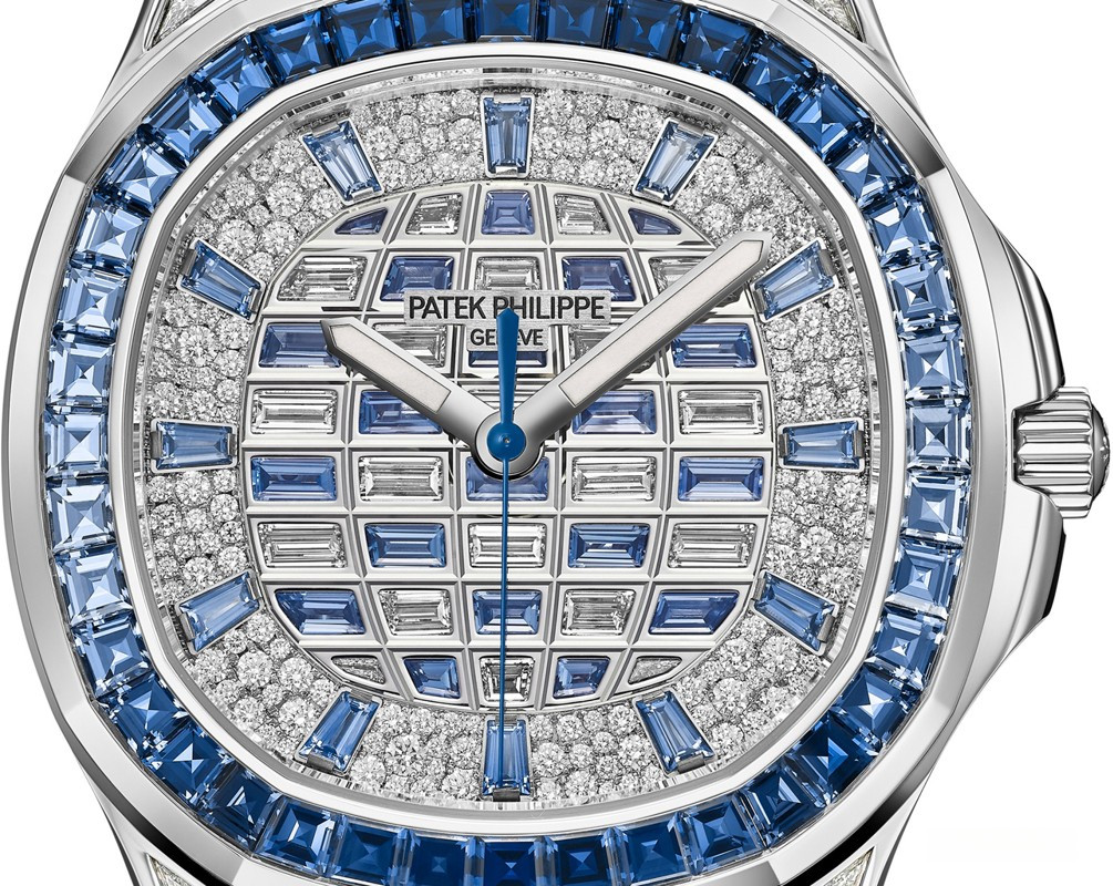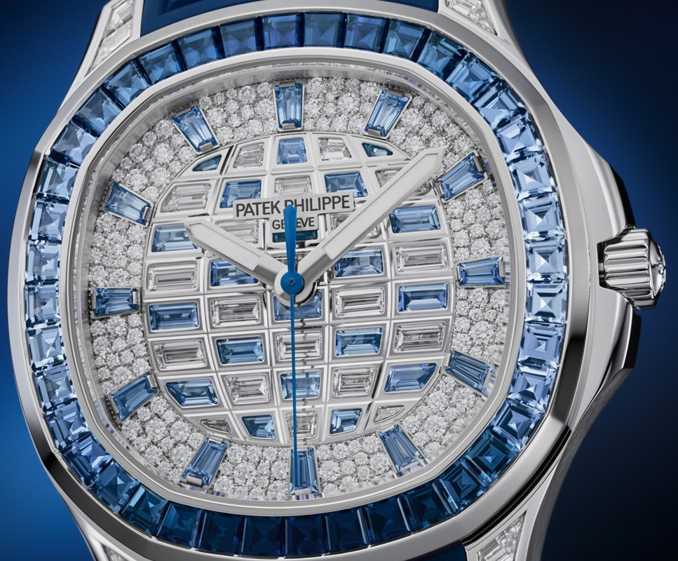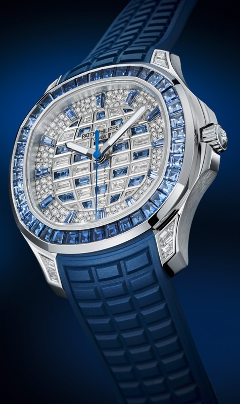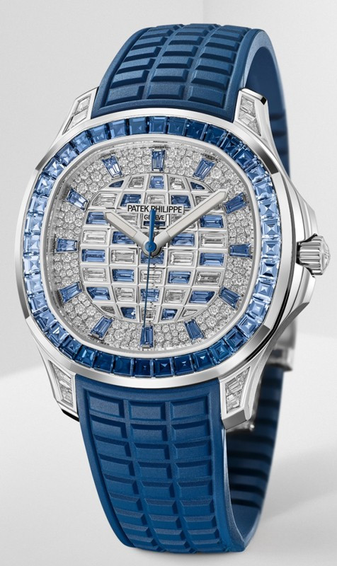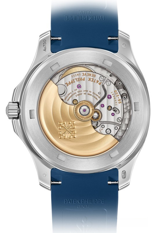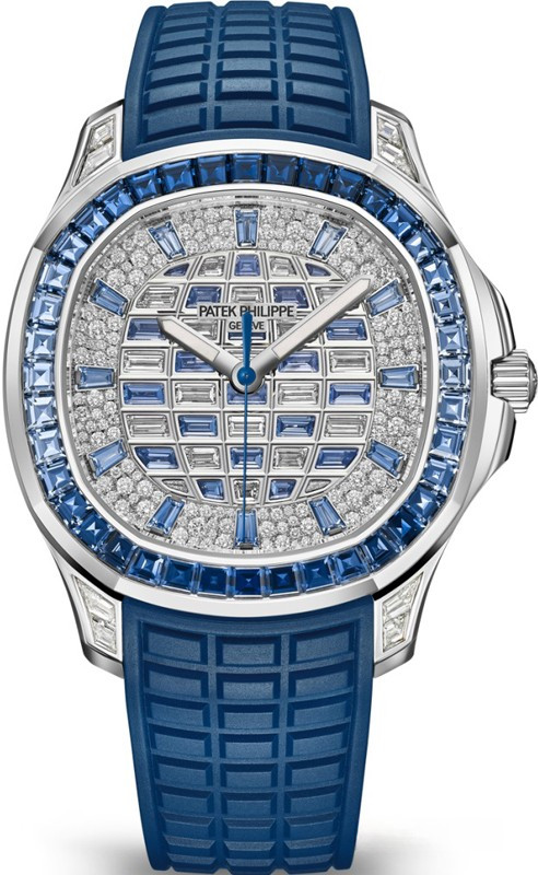 Часы Patek Philippe Aquanaut 5268 представлены в корпусе размером 38.8 х 9.1 мм из белого золота 18к водонепроницаемостью 30 метров. Внутри корпуса установлен автоматический механизм, Калибр CH 26?330 S, обладающий запасом хода 48 часов. На циферблате с белыми бриллиантами и синими сапфирами отображаются часы, минуты, секунды. Часы поставляются на каучуковом ремешке с золотой застежкой. Корпус инкрустирован белыми бриллиантами и синими сапфирами.