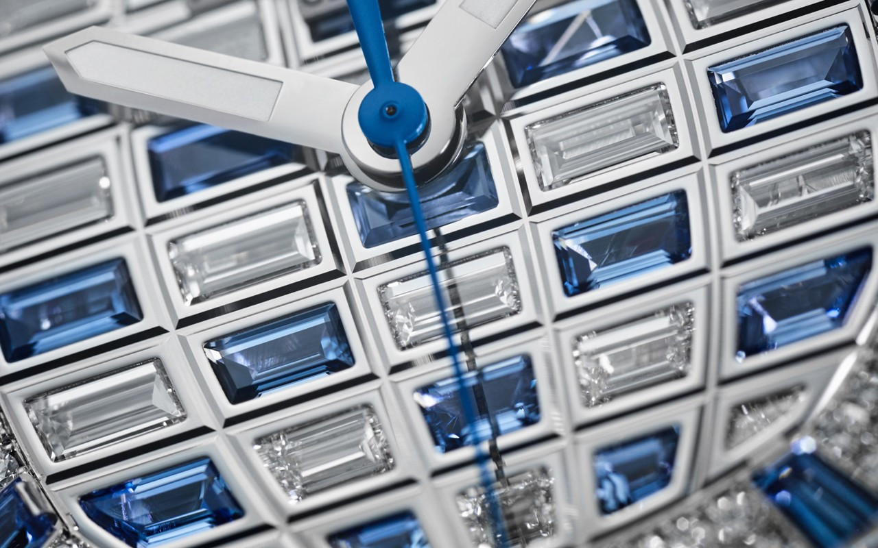 водонепроницаемость 30 м, корпус инкрустирован белыми бриллиантами и синими сапфирами