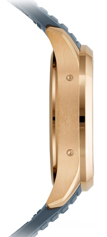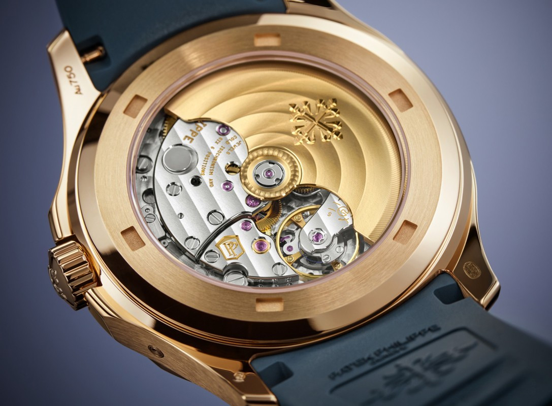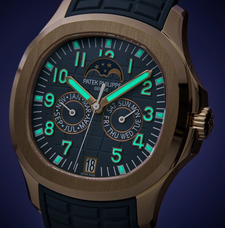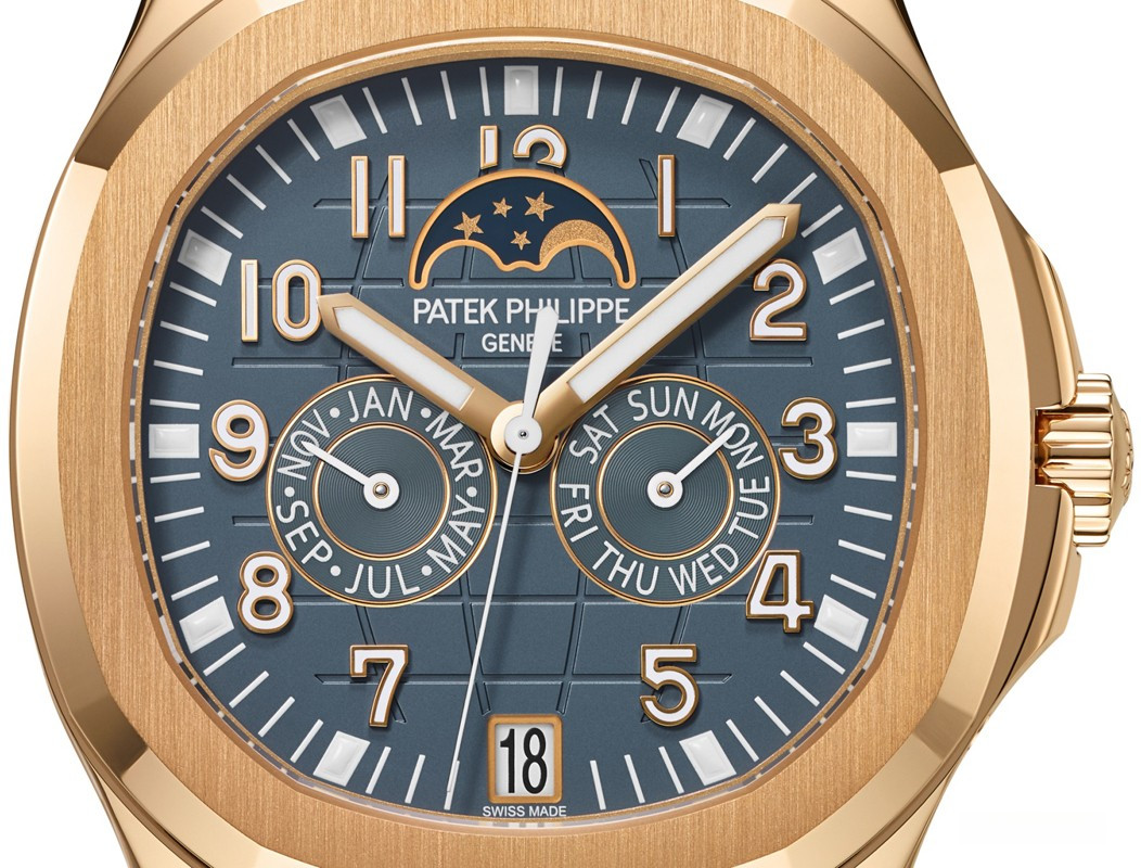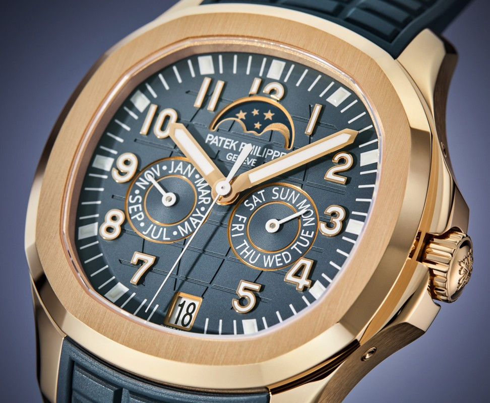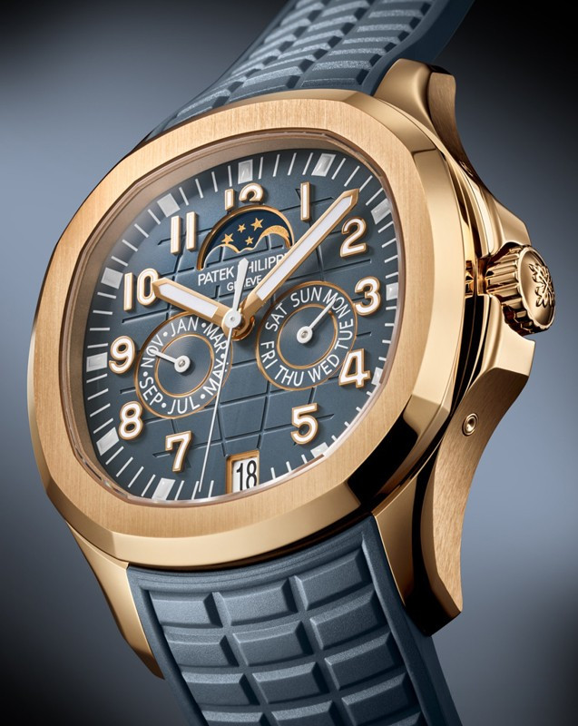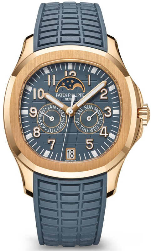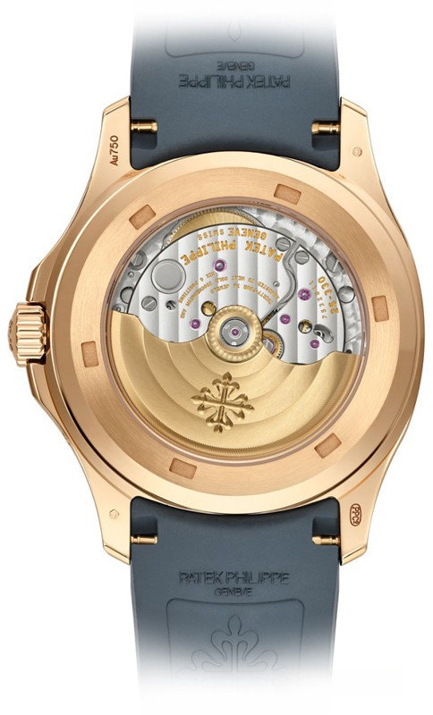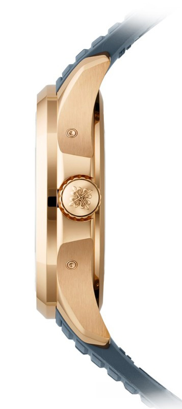 Часы Patek Philippe Aquanaut представлены в корпусе размером 39.9 х 10.9 мм из розового золота 18к водонепроницаемостью 30 метров. Внутри корпуса установлен автоматический механизм, Калибр 26-330 S QA LU, обладающий запасом хода 45 часов. На синем гильошированном циферблате отображаются часы, минуты, секунды, годовой календарь, фазы луны. Часы поставляются на каучуковом ремешке с золотой застежкой.