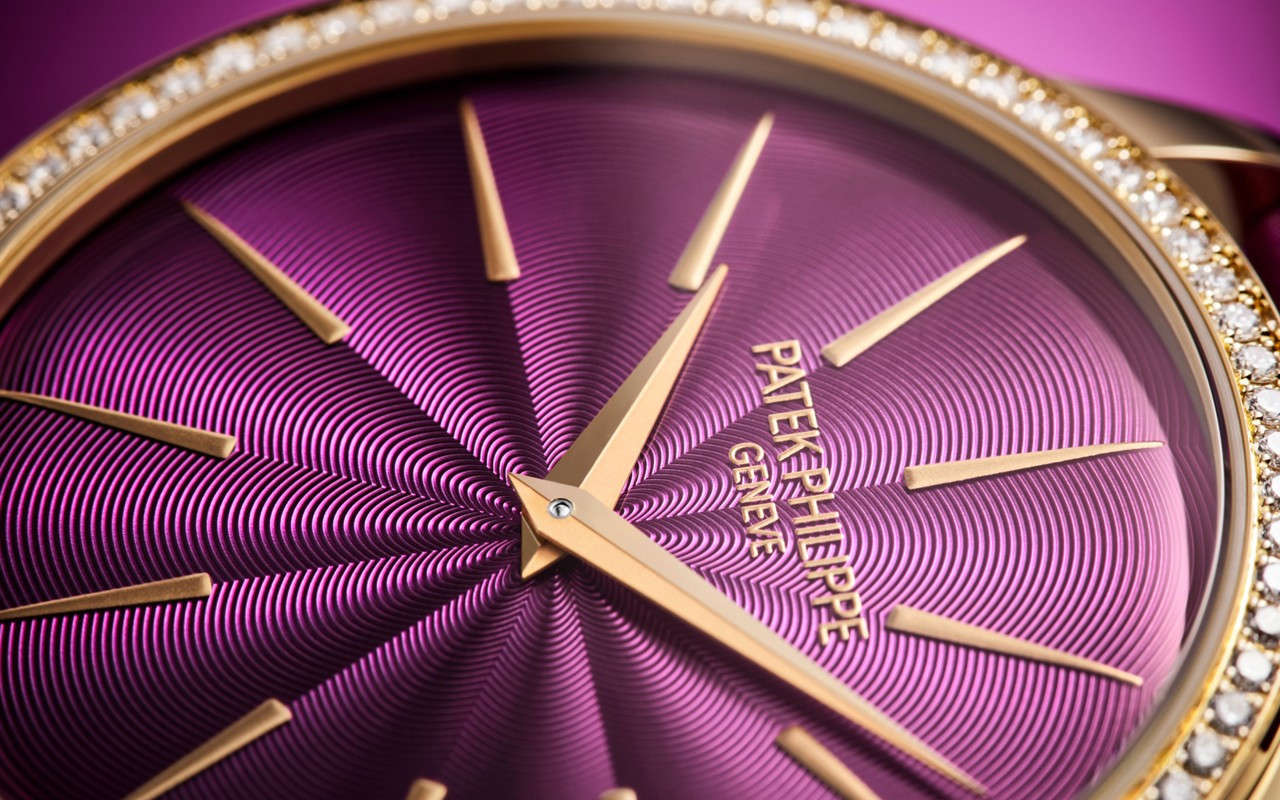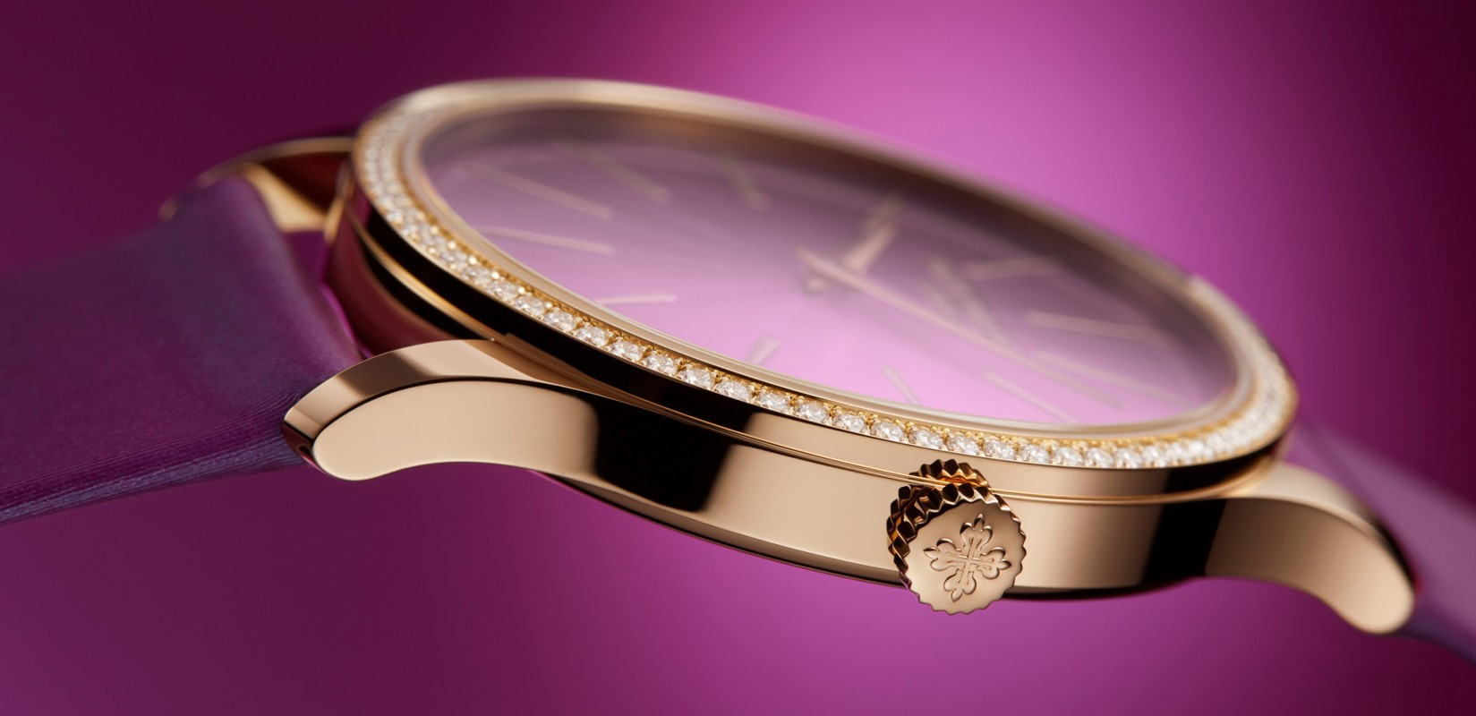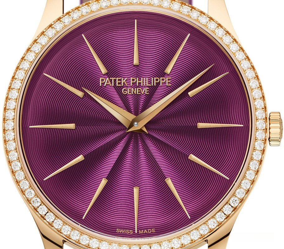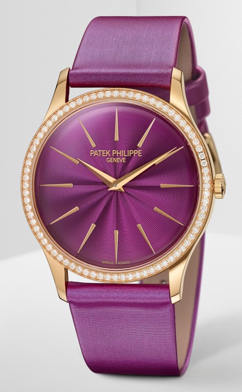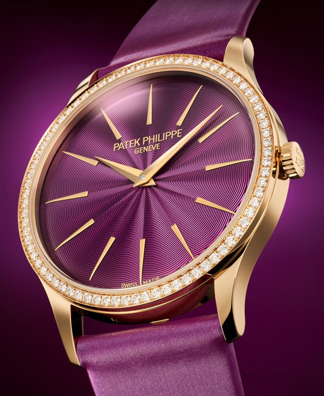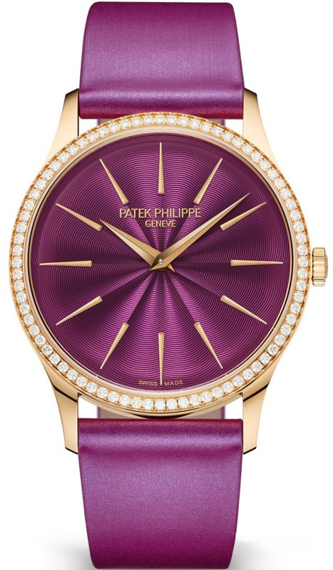 Patek Philippe дополняет ассортимент элегантных женских часов новой версией Модели 4997 Calatrava с автоподзаводом из розового золота. Новинка выдержана в оригинальном и изысканном фиолетовом цвете, идеально гармонирующим с теплыми оттенками благородного металла и блеском бриллиантов, украшающих безель. Пластина циферблата украшена рельефным узором в виде концентрических волн и покрыта более чем 50 слоями полупрозрачного лака, создающего завораживающий эффект глубины. Оттенку циферблата вторит ремешок из телячьей кожи фиолетового цвета с сатинированной отделкой и классической застежкой из розового золота. В корпусе расположен ультратонкий калибр 240 с автоматическим подзаводом. Ультратонкий механизм с автоматическим заводом. Калибр 240. Рельефный узор и часовые метки с напылением из розового золота и фиолетовым лаковым покрытием. Розовое золото. Задняя крышка из сапфирового стекла. Водонепроницаемость до 30 метров. Диаметр: 35 мм. Высота: 7,4 мм. 76 бриллиантов: ок. 0,55 карата (безель). Ремешок из телячьей кожи фиолетового цвета с сатинированной отделкой. Классическая застежка.