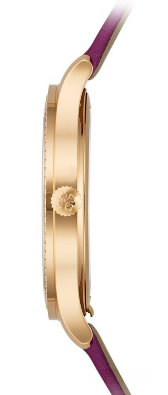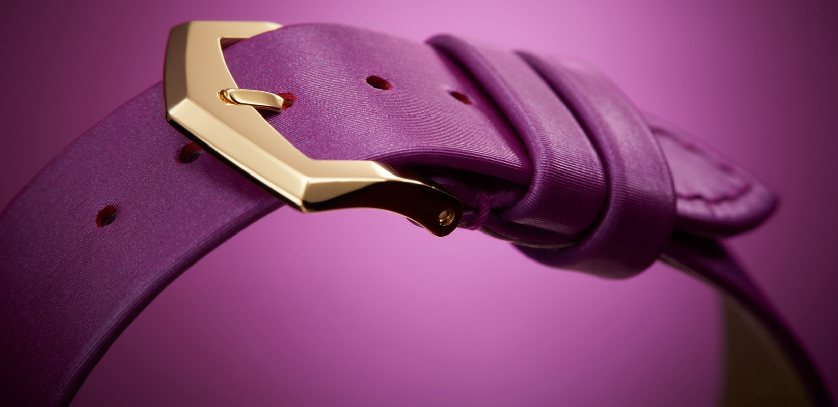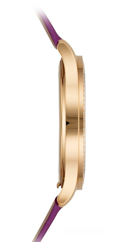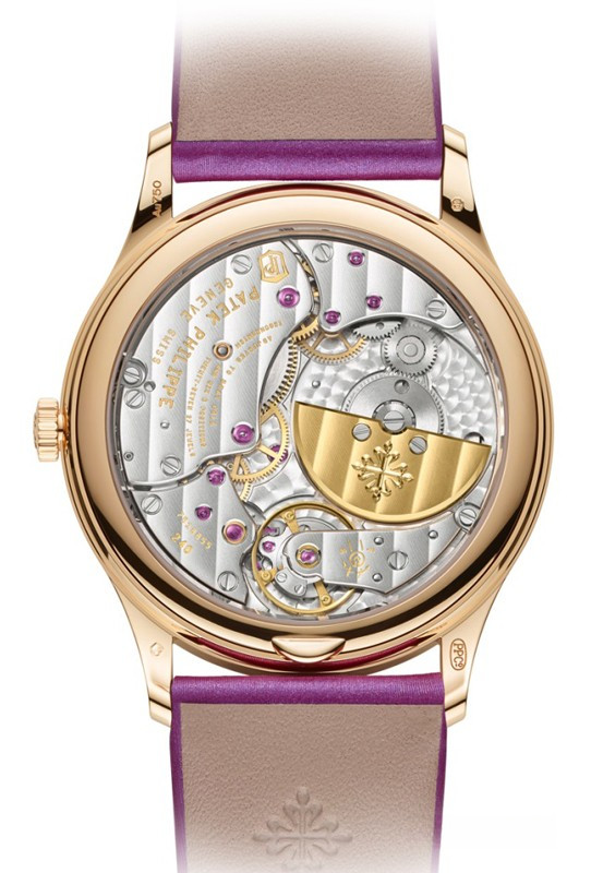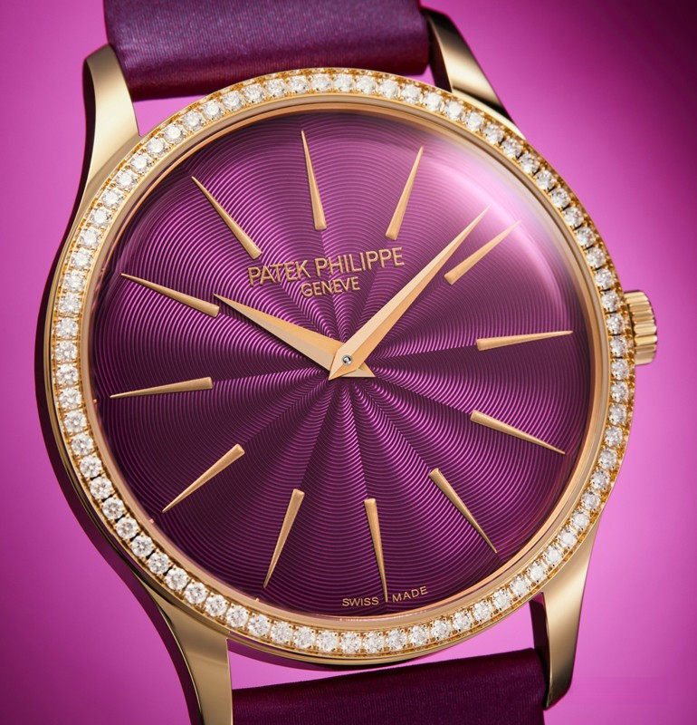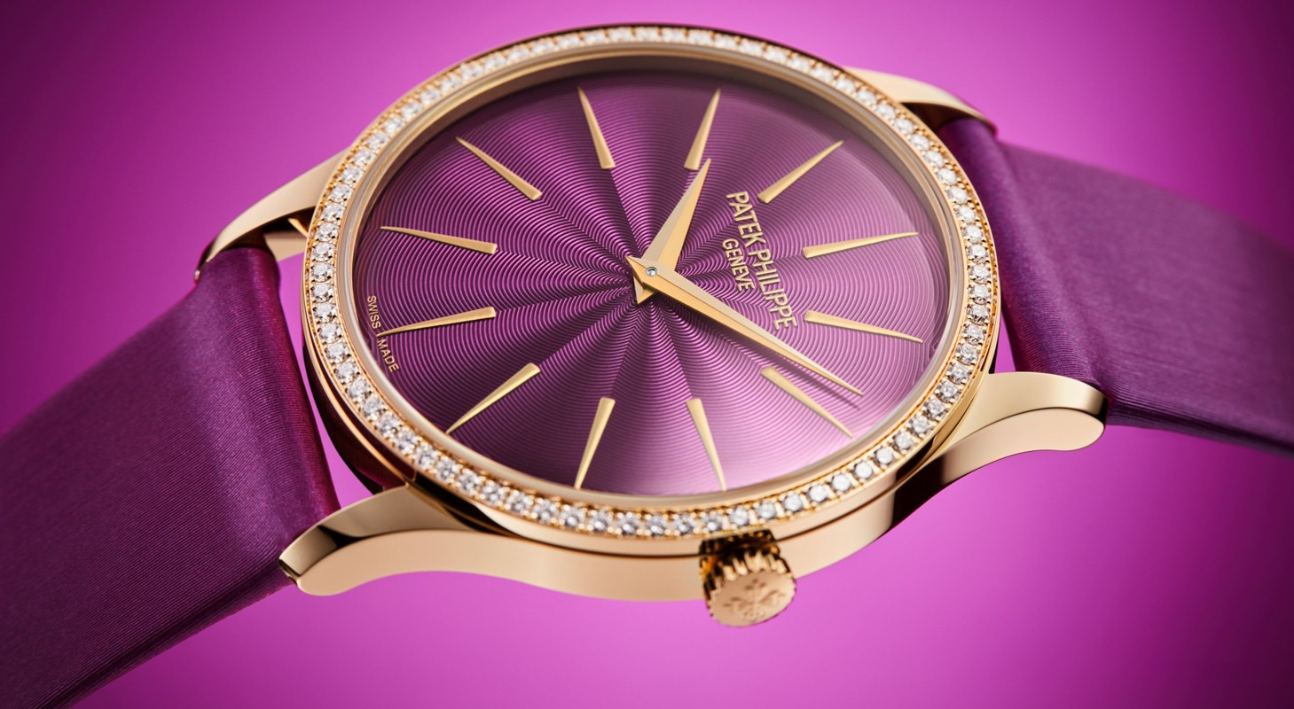 Patek Philippe дополняет ассортимент элегантных женских часов новой версией Модели 4997 Calatrava с автоподзаводом из розового золота. Новинка выдержана в оригинальном и изысканном фиолетовом цвете, идеально гармонирующим с теплыми оттенками благородного металла и блеском бриллиантов, украшающих безель. Пластина циферблата украшена рельефным узором в виде концентрических волн и покрыта более чем 50 слоями полупрозрачного лака, создающего завораживающий эффект глубины. Оттенку циферблата вторит ремешок из телячьей кожи фиолетового цвета с сатинированной отделкой и классической застежкой из розового золота. В корпусе расположен ультратонкий калибр 240 с автоматическим подзаводом. Ультратонкий механизм с автоматическим заводом. Калибр 240. Рельефный узор и часовые метки с напылением из розового золота и фиолетовым лаковым покрытием. Розовое золото. Задняя крышка из сапфирового стекла. Водонепроницаемость до 30 метров. Диаметр: 35 мм. Высота: 7,4 мм. 76 бриллиантов: ок. 0,55 карата (безель). Ремешок из телячьей кожи фиолетового цвета с сатинированной отделкой. Классическая застежка.