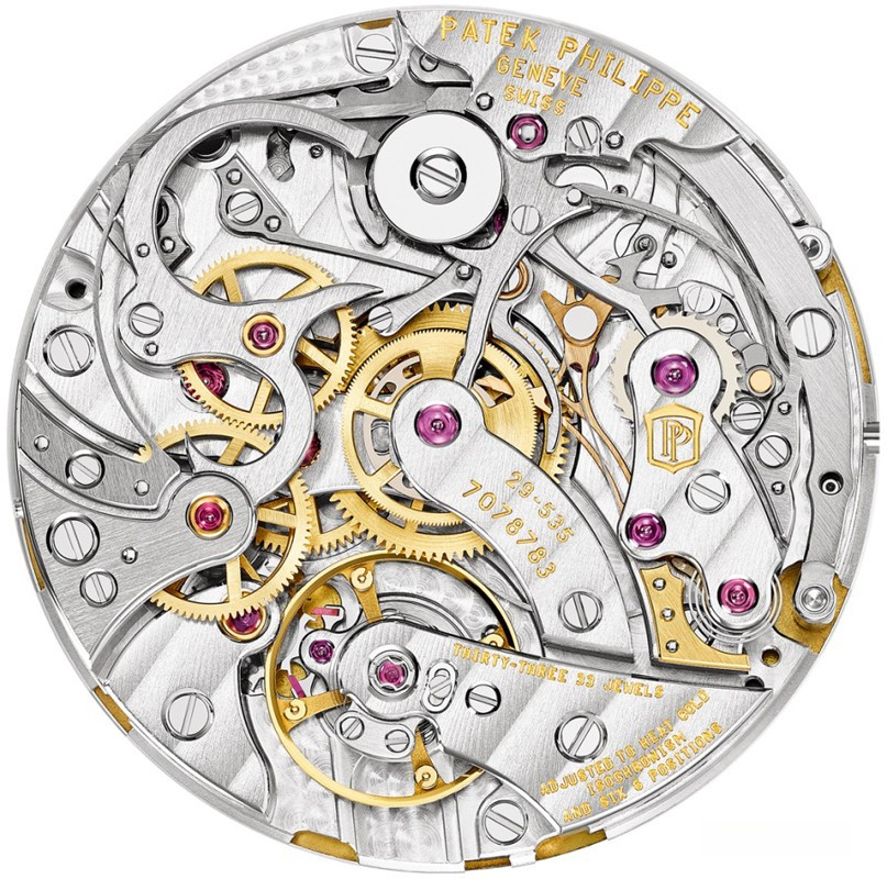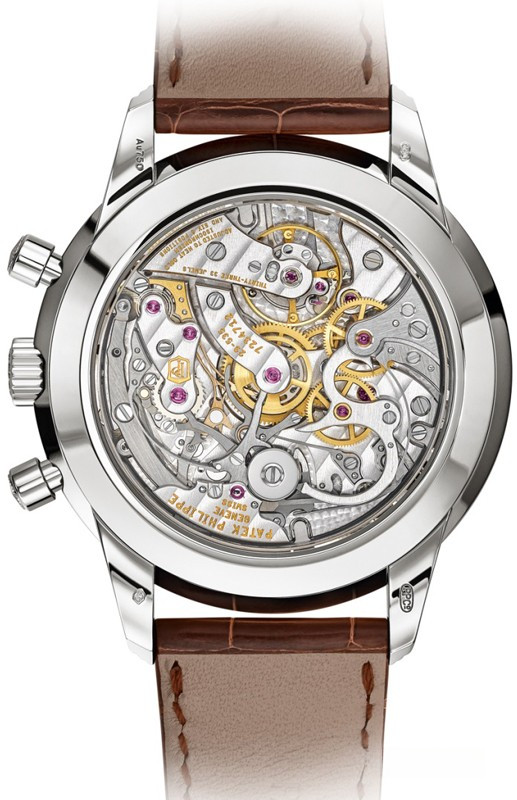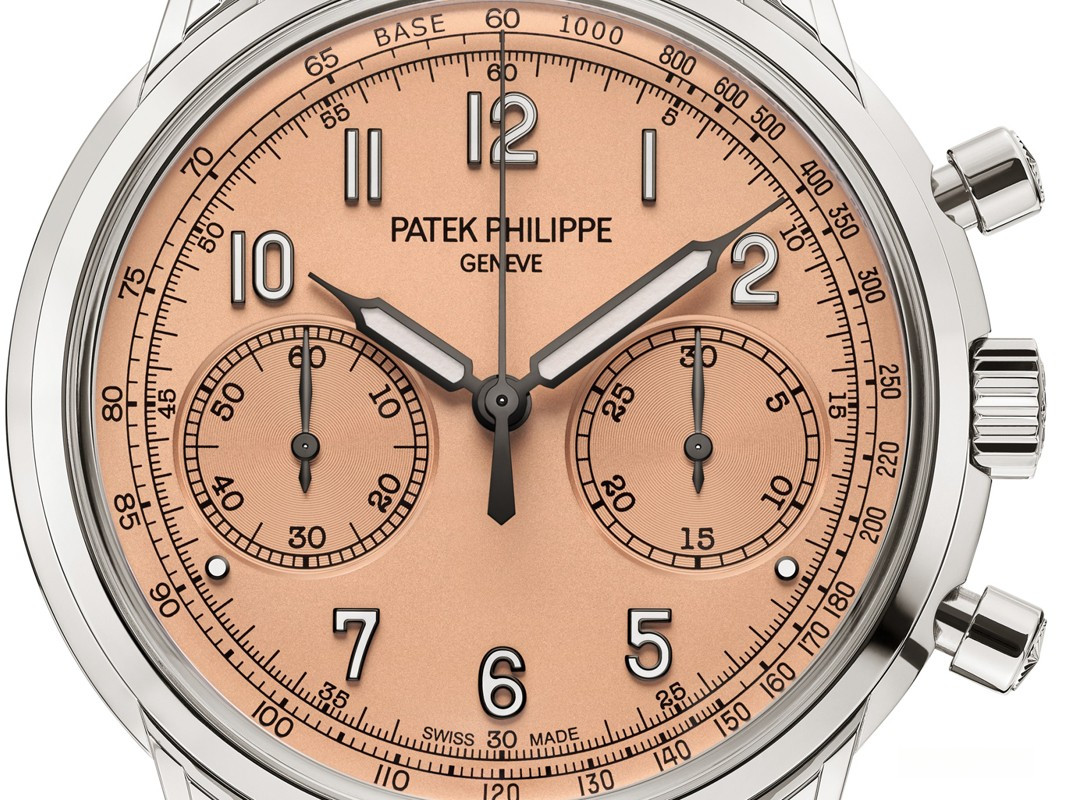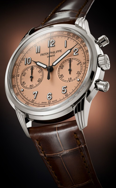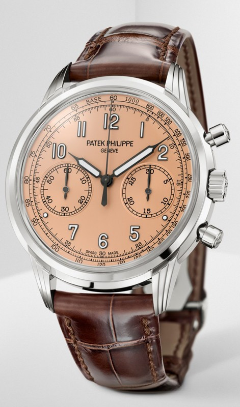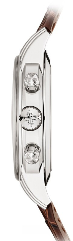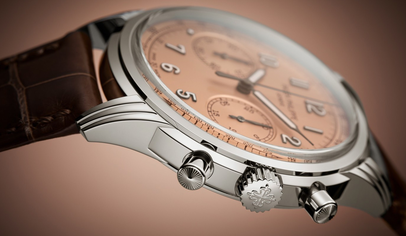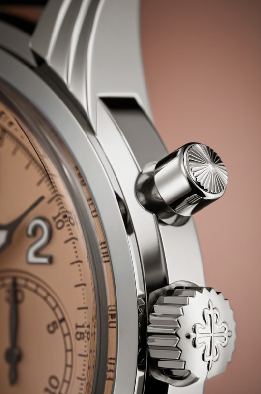 Patek Philippe представляет переосмысленную версию мужских часов, оснащенных хронографом классической конструкции с колонным колесом, горизонтальным сцеплением и ручным заводом. Дизайн новой модели с корпусом из белого золота дополнен круглыми кнопками с гильошированным узором и трехуровневыми ушками. Слегка выпуклое сапфировое стекло подчеркивает винтажный характер часов. Также полностью было изменено оформление циферблата: с розовым фоном выразительно контрастируют стрелки и накладные арабские цифры из белого золота с люминесцентным покрытием. Механизм с ручным заводом. Калибр CH 29-535 PS. Малая секундная стрелка. Синий лакированный циферблат, накладные золотые цифры с люминесцентным покрытием. Тахиметрическая шкала. Корпус из белого золото 18к. Задняя крышка из сапфирового стекла. Водонепроницаемость до 30 метров. Диаметр: 41 мм. Высота: 11,45 мм. Прошитый вручную ремешок, кожа аллигаторо коричневого цвета. Раскладывающаяся застежка.