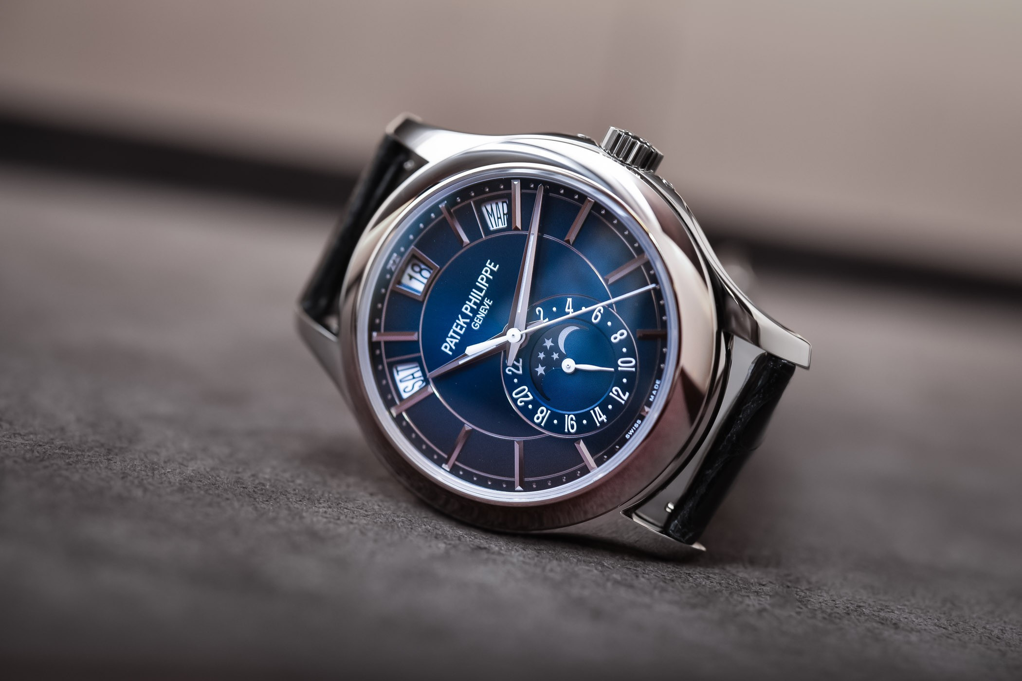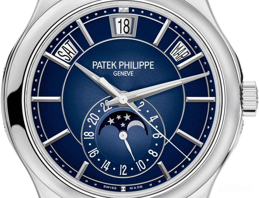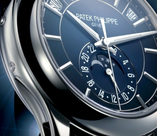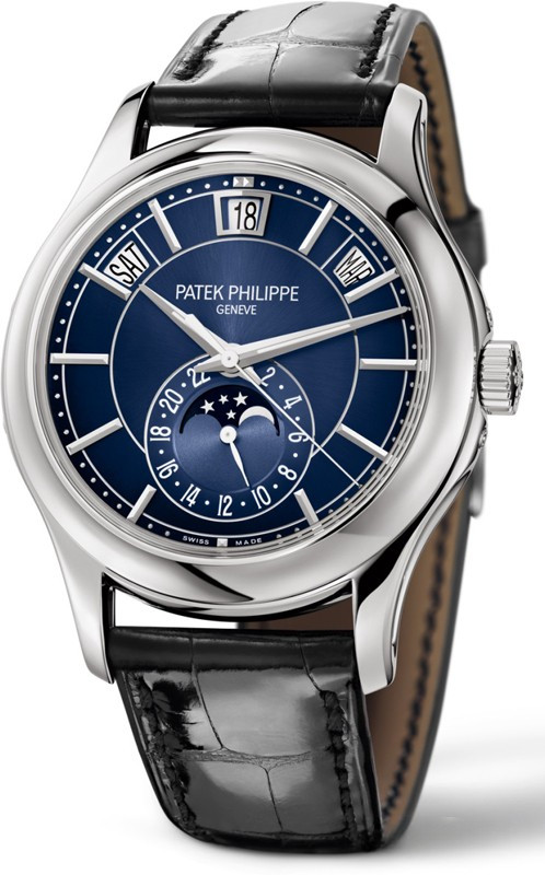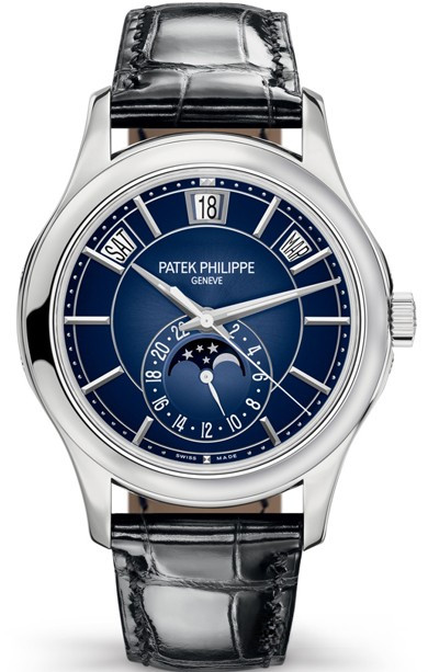 Астрономические часы Patek Philippe Complications 5205 5205G-013 выпущены в круглом корпусе из белого золота 18к. Размер составляет 40 х 11,36 мм, водонепроницаемость до 30 м и годовым календарем. Внутри корпуса установлен автоматический механизм, Калибр Patek Philippe 324 S QA LU 24 H, обеспечивающий запас хода 45 часов. На синем циферблате отображаются часы, минуты, секунды, дата, день недели, месяц, фаза луны, 24-х часовой указатель. Часы комплектуются ремешком из кожи аллигатора с вставкой из белого золота 18к.