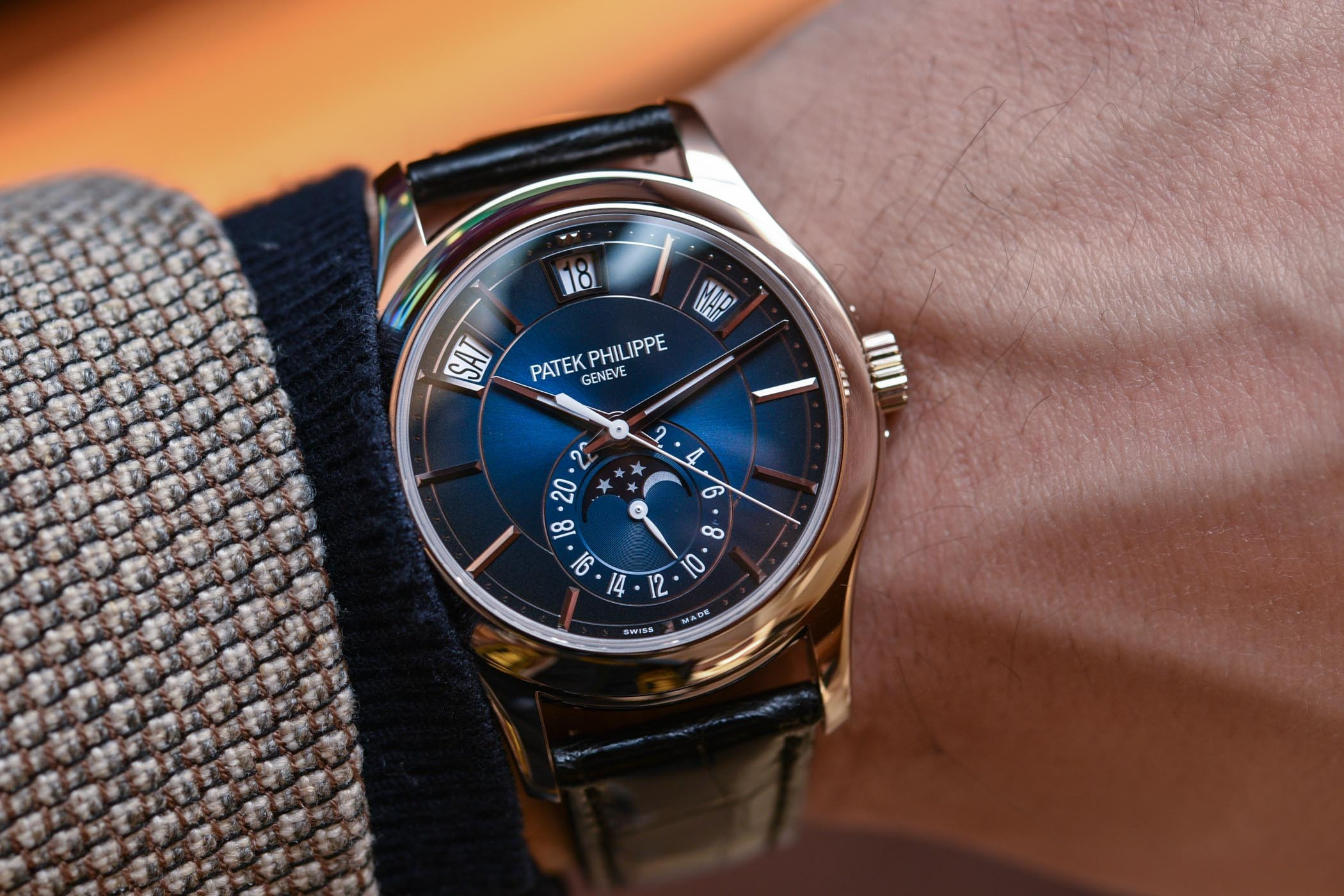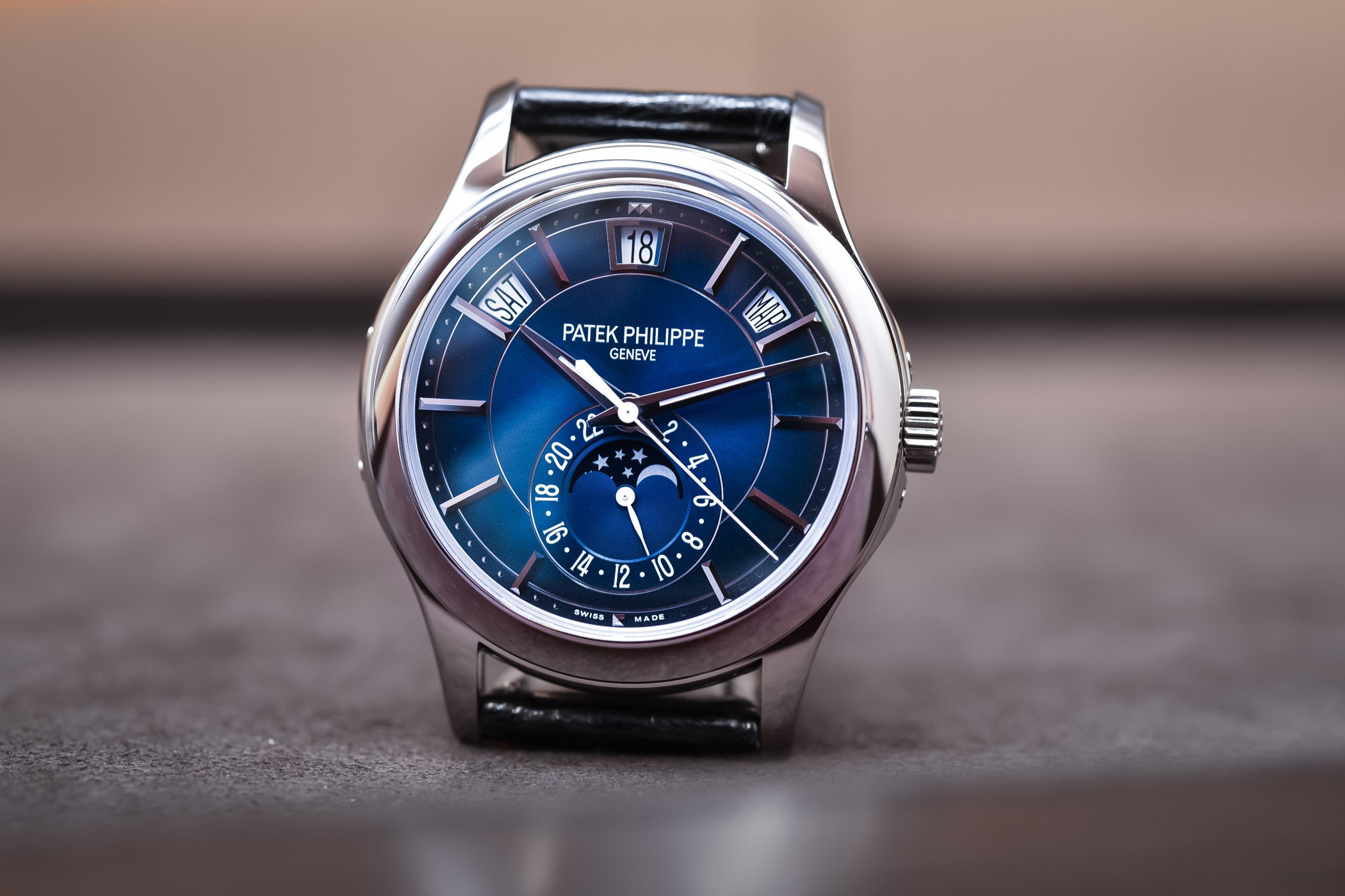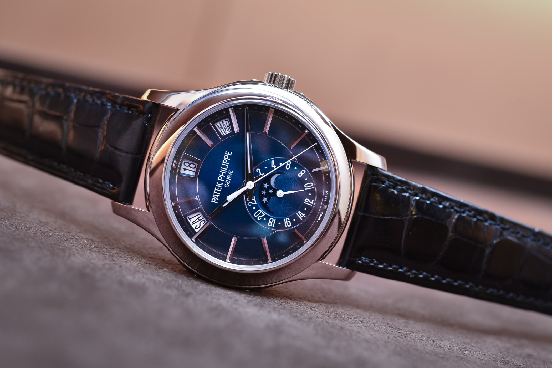 Астрономические часы Patek Philippe Complications 5205 5205G-013 выпущены в круглом корпусе из белого золота 18к. Размер составляет 40 х 11,36 мм, водонепроницаемость до 30 м и годовым календарем. Внутри корпуса установлен автоматический механизм, Калибр Patek Philippe 324 S QA LU 24 H, обеспечивающий запас хода 45 часов. На синем циферблате отображаются часы, минуты, секунды, дата, день недели, месяц, фаза луны, 24-х часовой указатель. Часы комплектуются ремешком из кожи аллигатора с вставкой из белого золота 18к.