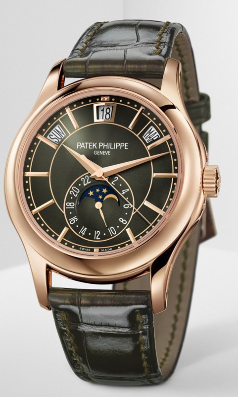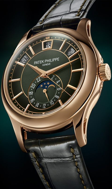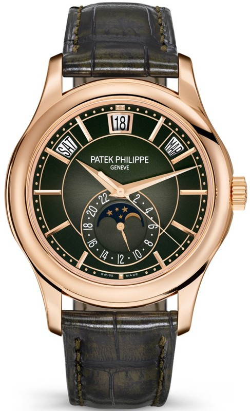 Астрономические часы Patek Philippe Complications 5205 выпущены в круглом корпусе из розового золота 18к. Размер составляет 40 х 11.36 мм, водонепроницаемость до 30 м и годовым календарем. Внутри корпуса установлен автоматический механизм, Калибр Patek Philippe 324 S QA LU 24 H, обеспечивающий запас хода 45 часов. На синем циферблате отображаются часы, минуты, секунды, дата, день недели, месяц, фаза луны, 24-х часовой указатель. Часы комплектуются ремешком из кожи аллигатора с золотой застежкой.
