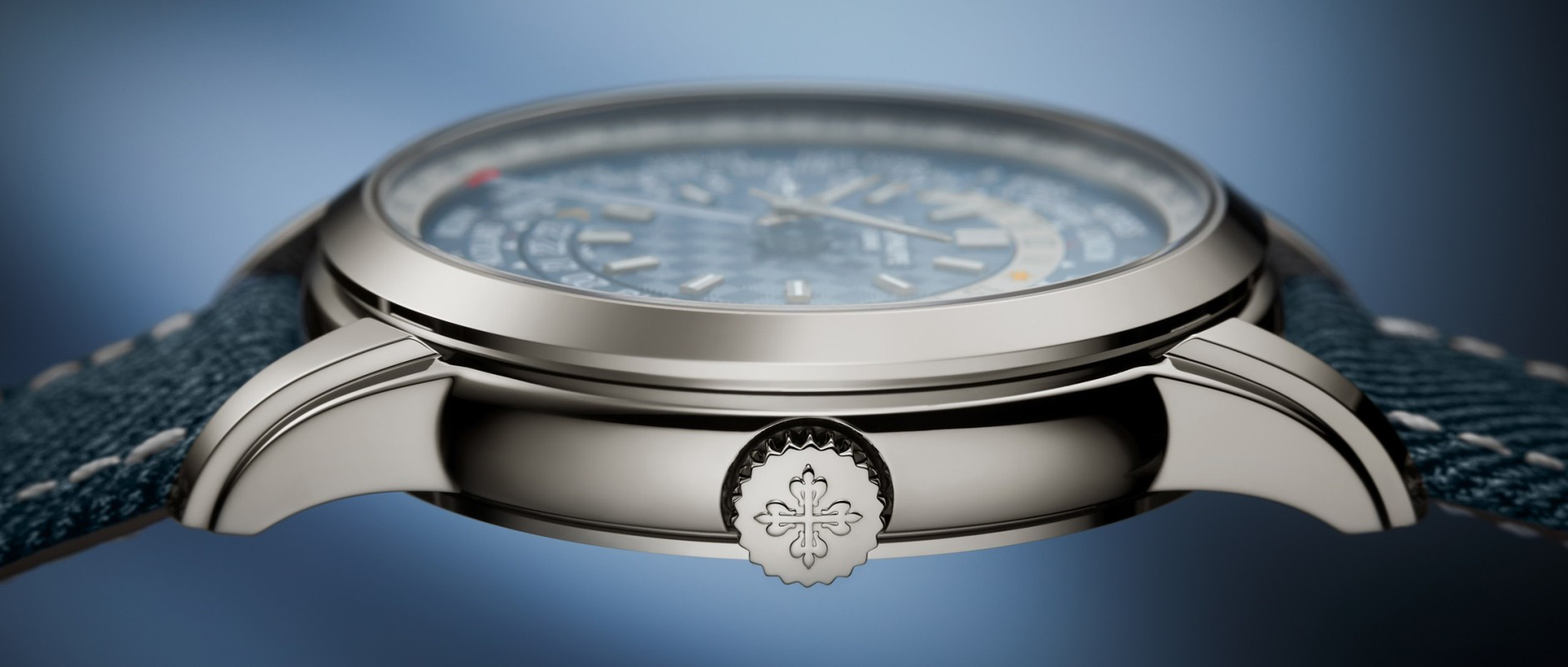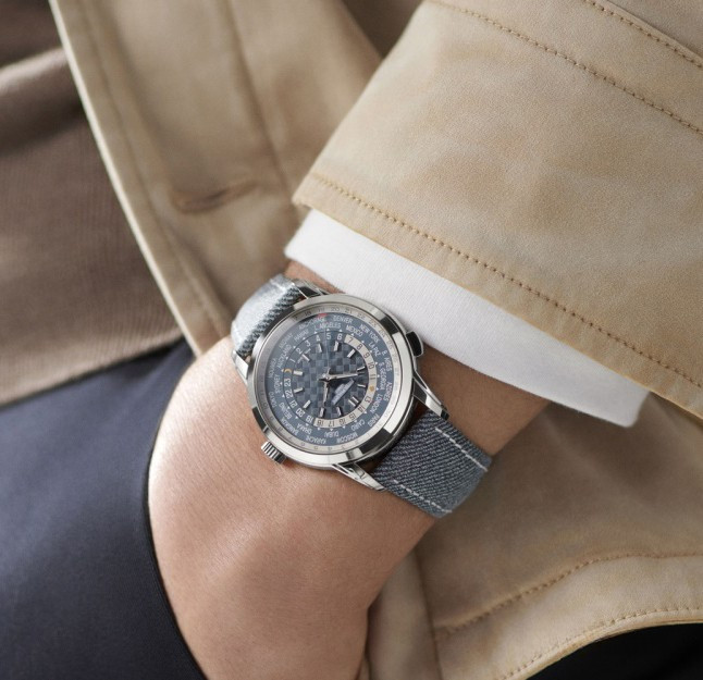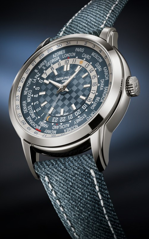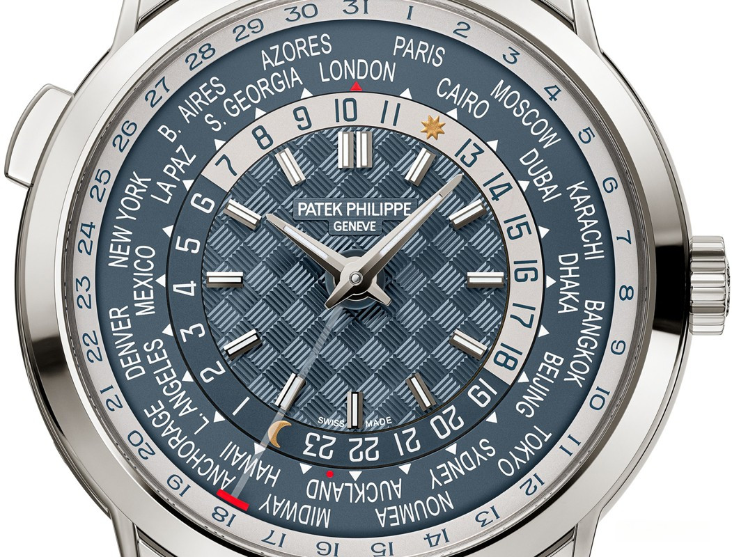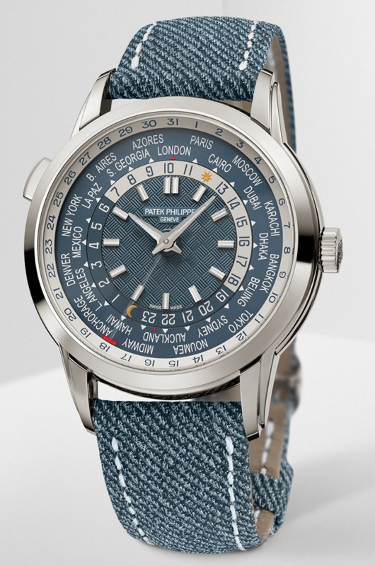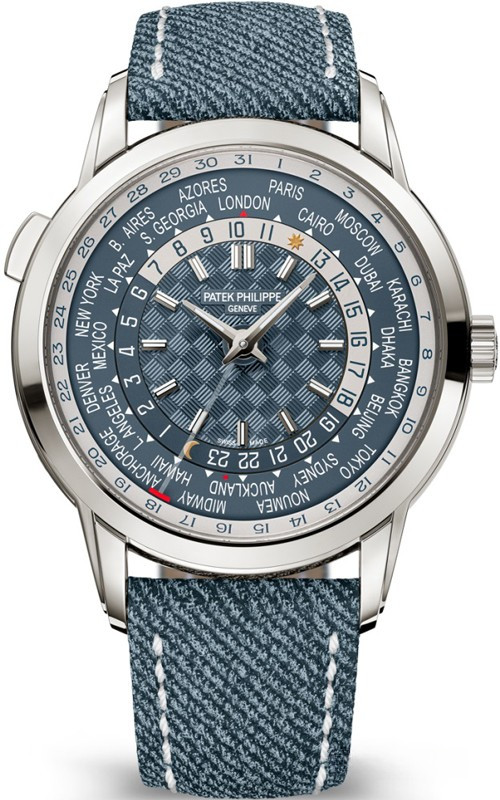 Часы Patek Philippe Complications представлены в корпусе размером 40 х 11.57 мм из белого золота 18к водонепроницаемостью 30 метров. Внутри корпуса установлен механизм с ручным заводом, Калибр 240 HU C, обладающий запасом хода 45 часов. На сером гильшированном циферблате отображаются часы, минуты, дата, индикатор день/ночь, ворлдтаймер. Часы поставляются на текстильном ремешке с золотой застежкой.