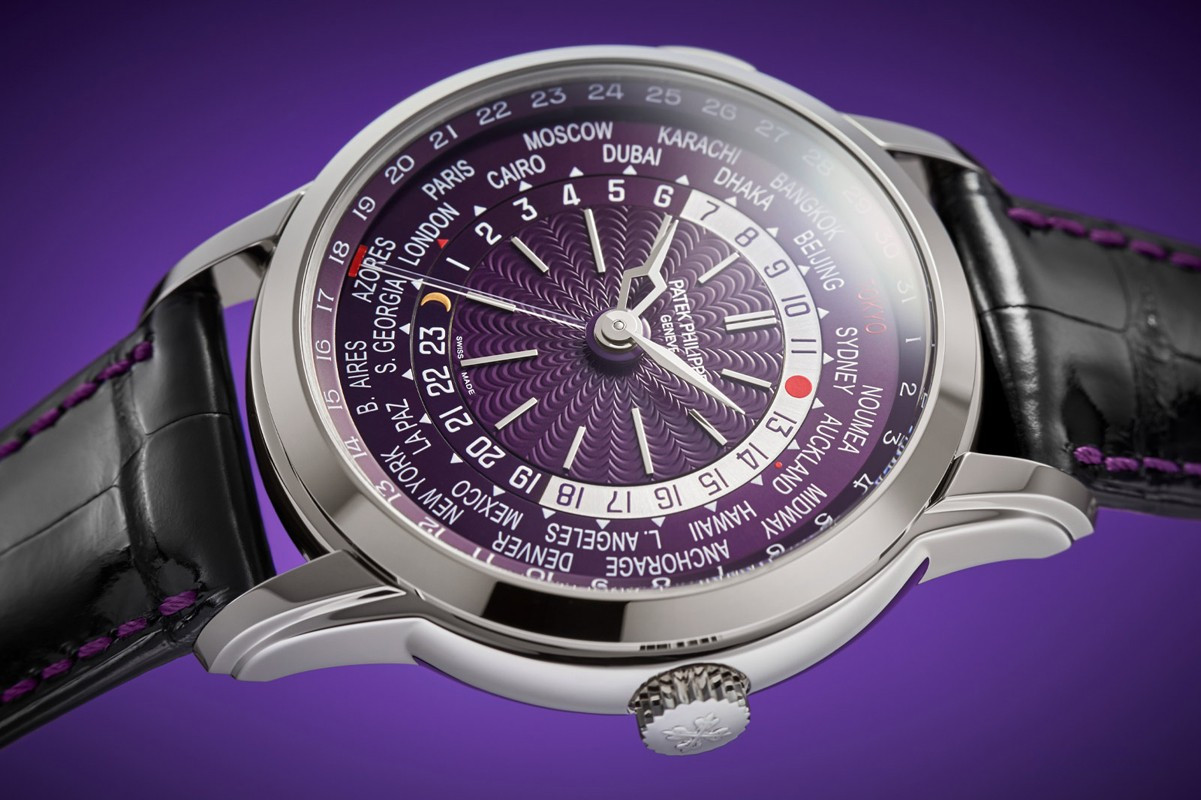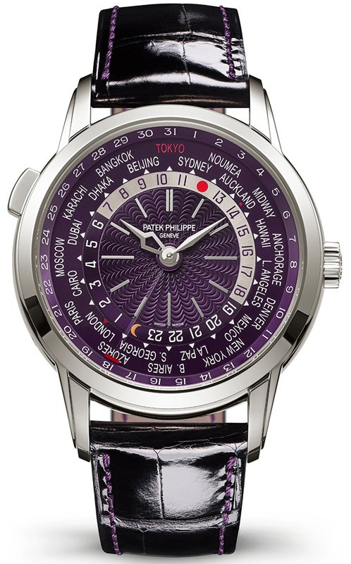 Часы Patek Philippe Complications представлены в корпусе размером 40 х 11.57 мм из белого золота 18к водонепроницаемостью 30 метров. Внутри корпуса установлен механизм с ручным заводом, Калибр 240 HU C, обладающий запасом хода 45 часов. На фиолетовом гильшированном циферблате отображаются часы, минуты, дата, индикатор день/ночь, ворлдтаймер. Часы поставляются на ремешке из кожи аллигатора с золотой застежкой. Серия ограничена - 300 шт.