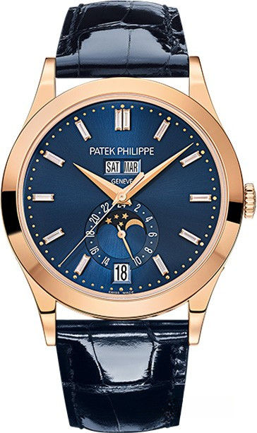 Астрономические часы Patek Philippe Complications 5396R-014 выпущены в круглом корпусе из розового золота 18к. Размер составляет 38.5 мм, водонепроницаемость до 30 м и годовым календарем. Внутри корпуса установлен автоматический механизм, Калибр Patek Philippe 324 S QA LU 24H/303, обеспечивающий запас хода 45 часов. На синем циферблате с 12-ю белыми багетными бриллиантами отображаются часы, минуты, секунды, дата, день недели, месяц, фаза луны, 24-х часовой указатель. Часы комплектуются ремешком из кожи аллигатора с золотой вставкой.