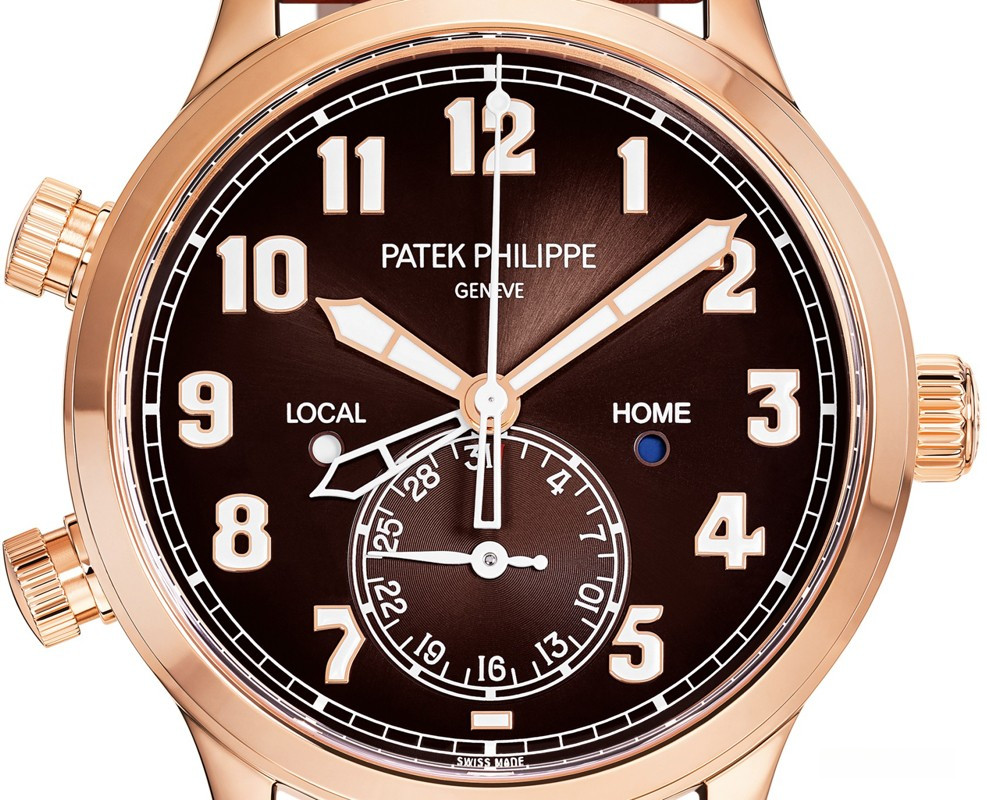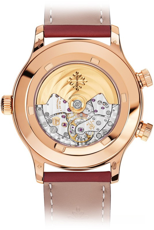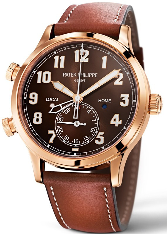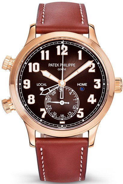 Новая версия из розового золота с коричневым циферблатом. Часы Calatrava Pilot Travel Time Мод. 5524 с индикацией времени второго часового пояса и указателем даты местного времени были выпущены в 2015 году в корпусе из белого золота с синим циферблатом. Сегодня компания представляет новую версию из розового золота с циферблатом с эффектом перехода оттенков от коричневого к черному. Это элегантная и смелая дебютная версия часов является данью уважения классическим авиационным часам Patek Philippe. Механизм с автоматическим заводом. Калибр 324 S C FUS. Calatrava Pilot Travel Time. Индикация времени в двух часовых поясах: в месте нахождения и месте проживания. Индикация времени суток в месте нахождения и месте проживания в окошках. Индикация даты в месте нахождения с помощью стрелки. Центральная секундная стрелка. С узором «солнечные лучи» и эффектом перехода оттенков от коричневого к черному, накладные золотые цифры с люминесцентным покрытием. Винтажный коричневый из кожи теленка. Классическая застежка. Задняя крышка из сапфирового стекла. Водонепроницаемость до 60 метров. Диаметр корпуса: 42 мм. Высота: 10,78 мм. Розовое золото.