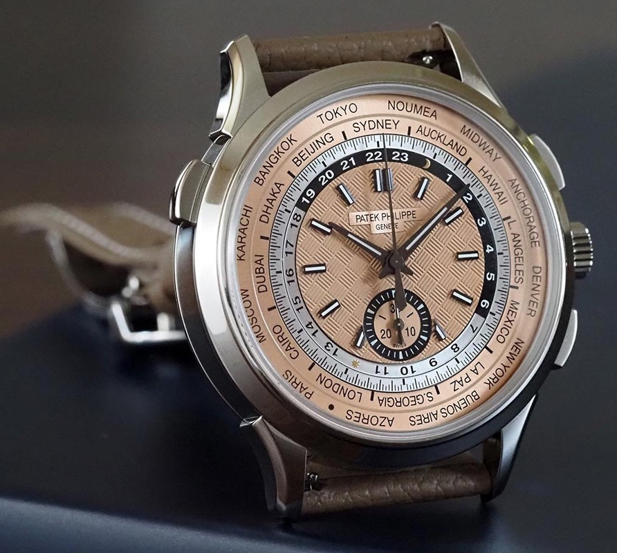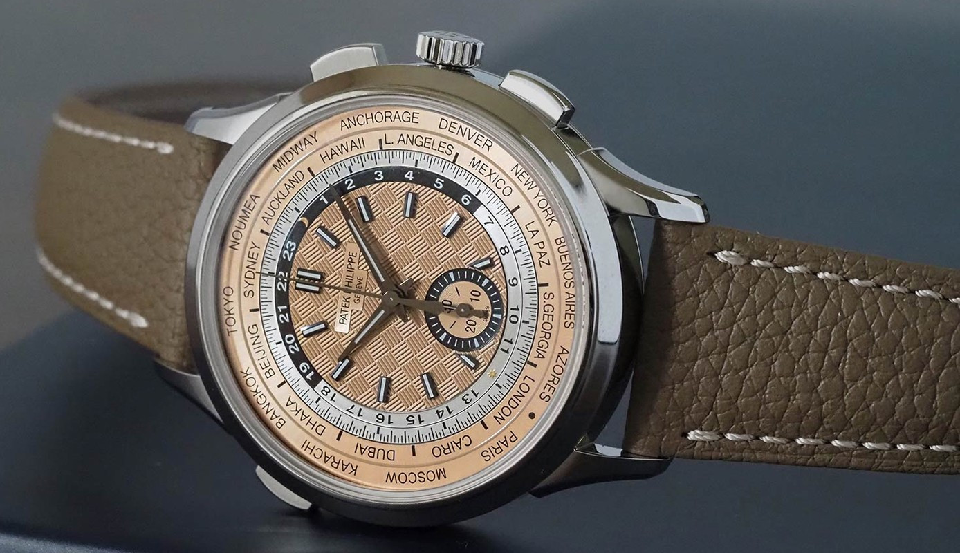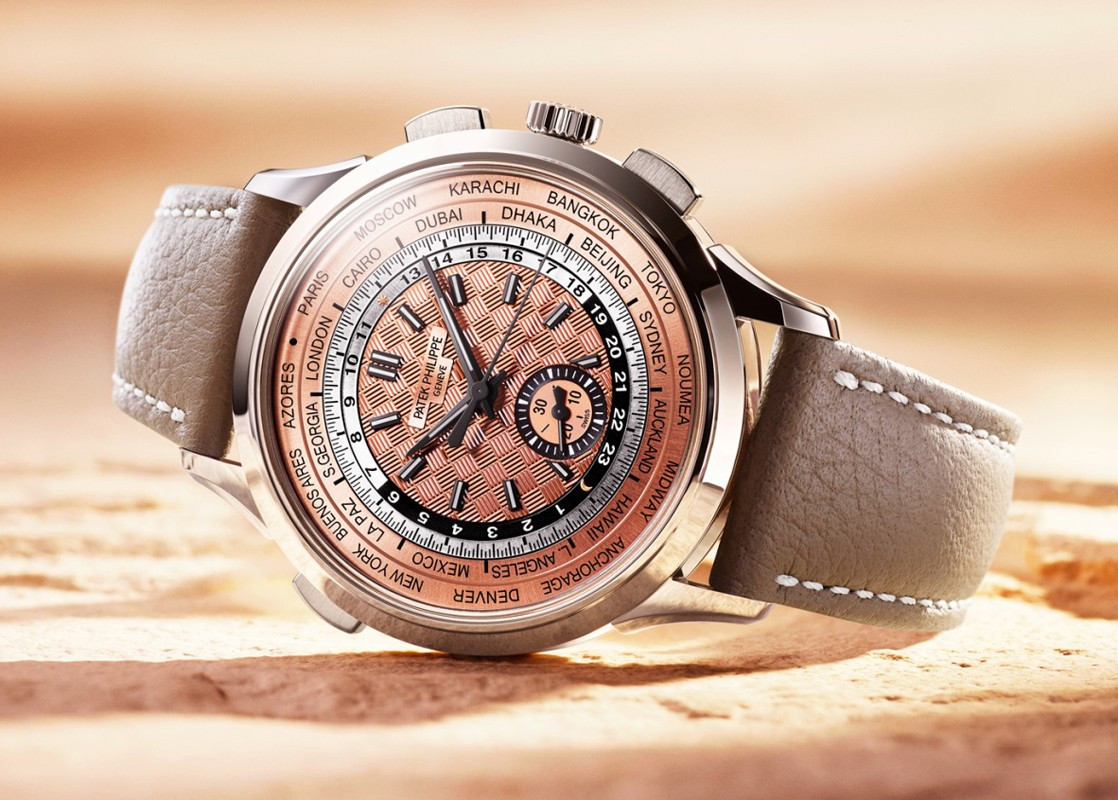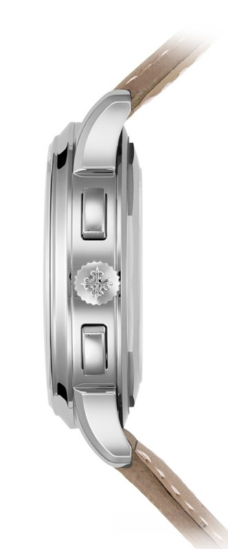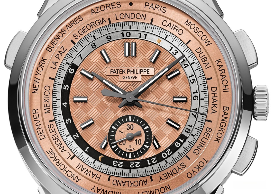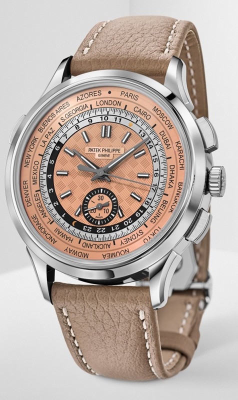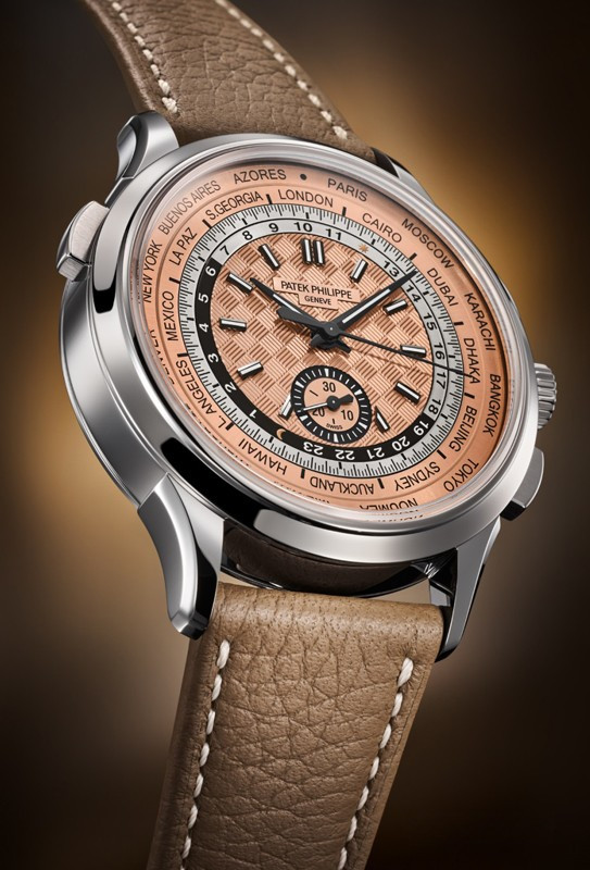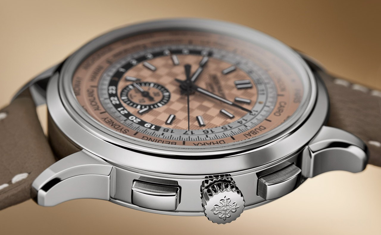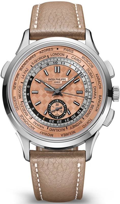 Хронограф реф. 5935A-001 с автоматическим подзаводом World Time flyback – первая версия культового хронографа, выполненная из нержавеющей стали. Часы выделяются своим спортивно-винтажным стилем. Узор Сarbon в центре опалово-розового позолоченного циферблата воплощает современный, динамичный дух. Функция мирового времени показывает время в 24 часовых поясах одновременно. Часы функционируют на основе эксклюзивного запатентованного механизма с возможностью коррекции показателей всех дисплеев при нажатии на кнопку в положении «10 часов». Модель представлена в версии с двумя ремешками из телячьей кожи: зернистым серо-коричневого цвета и бежевым с отделкой из нубука.