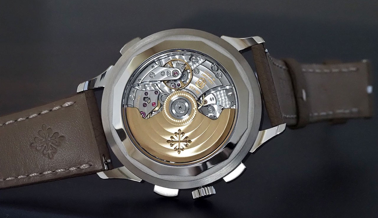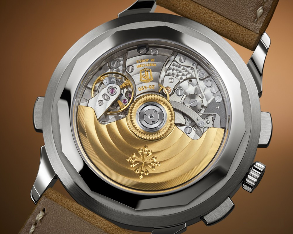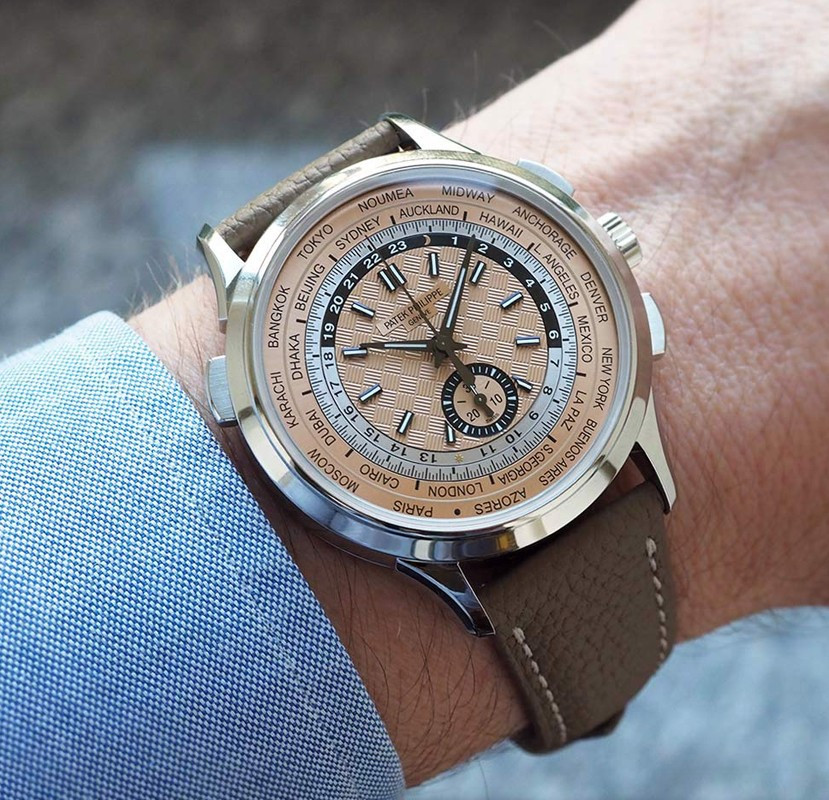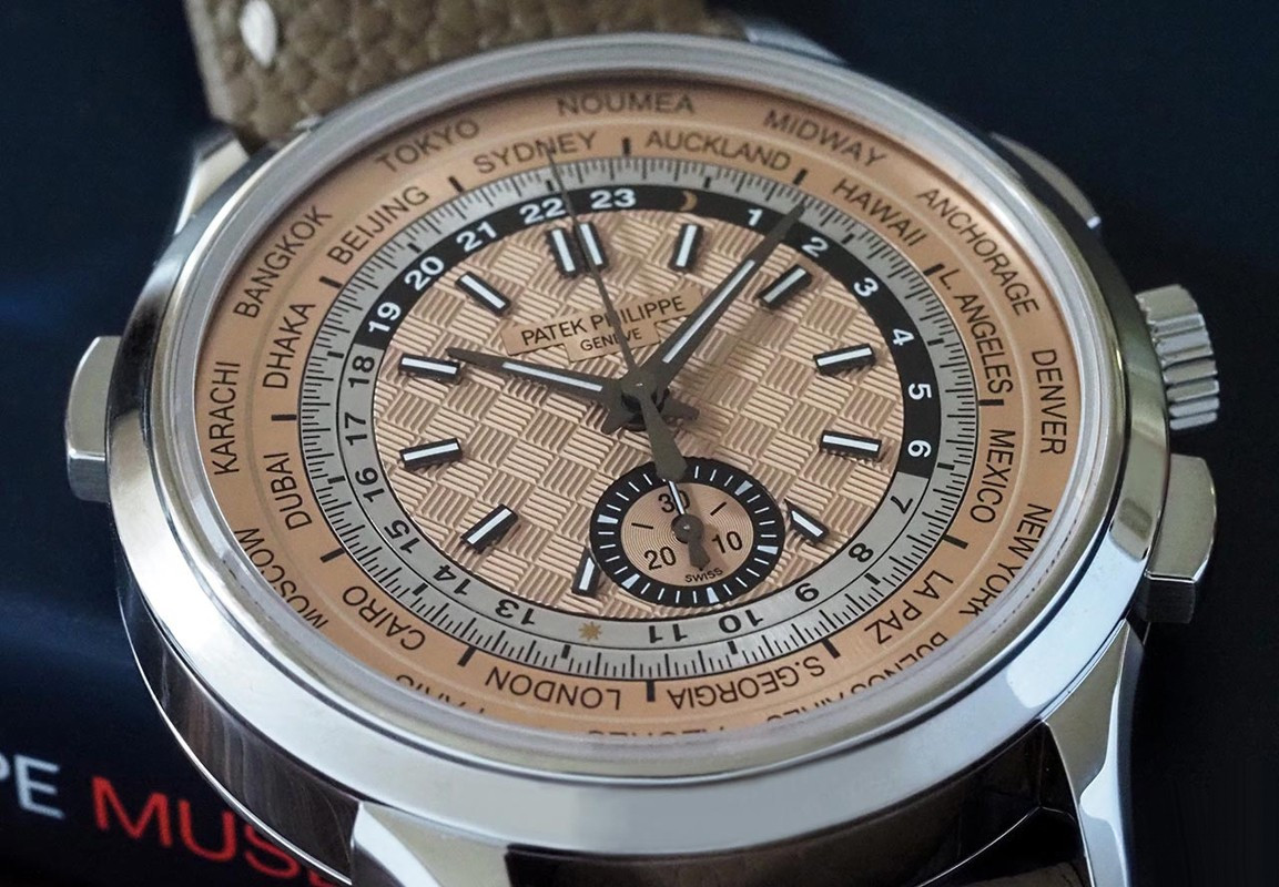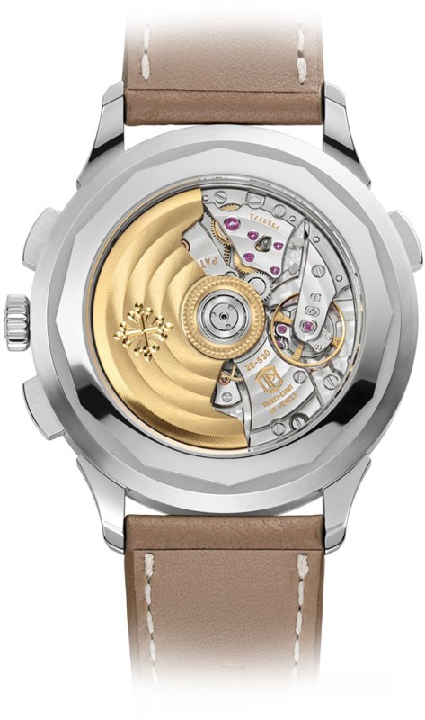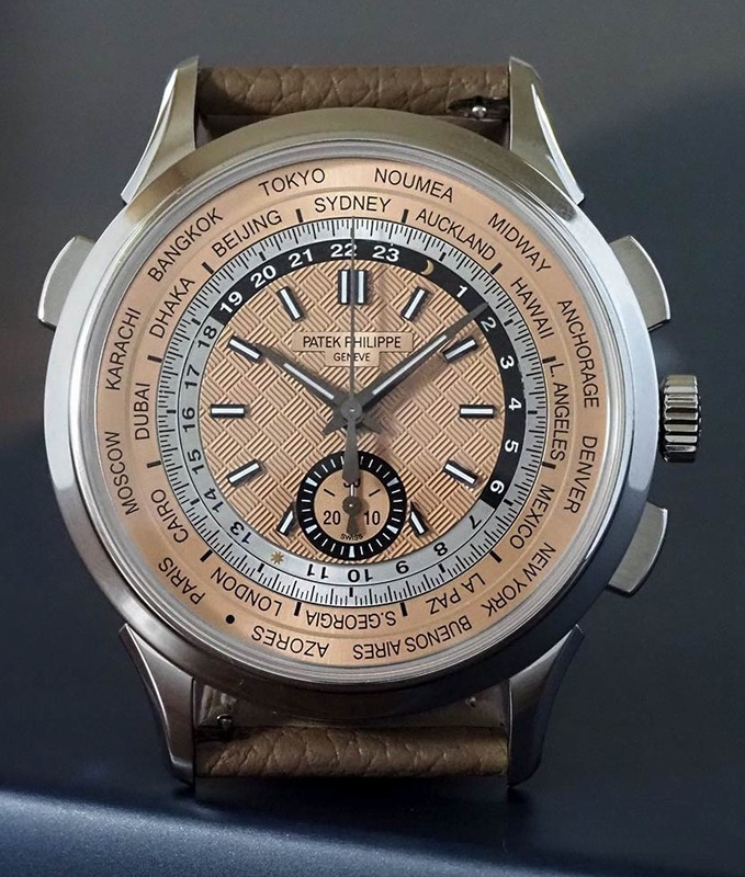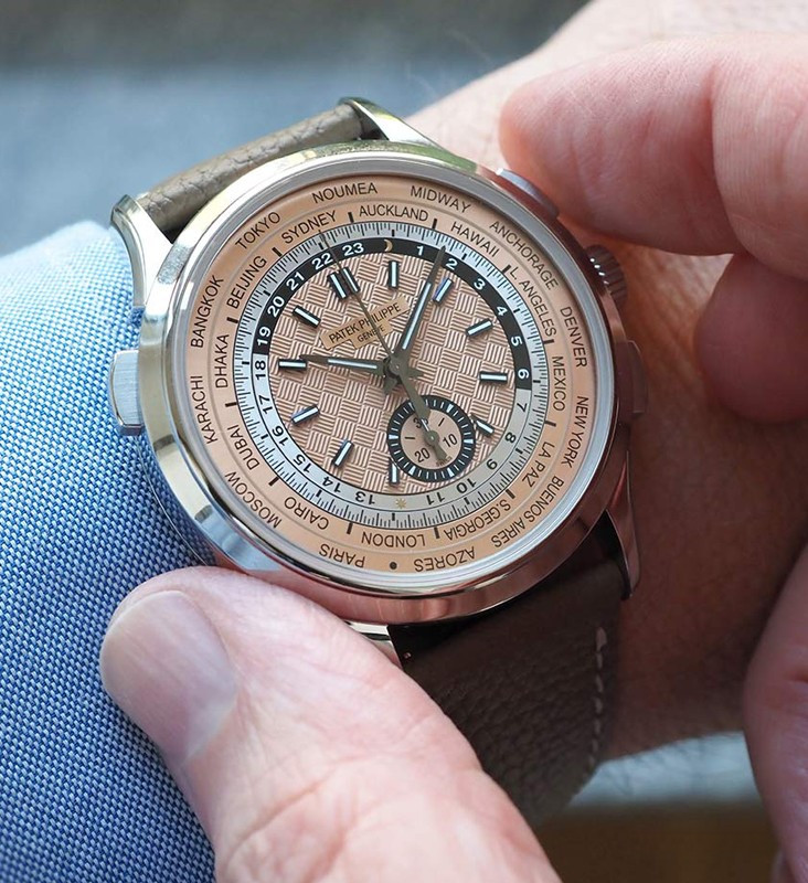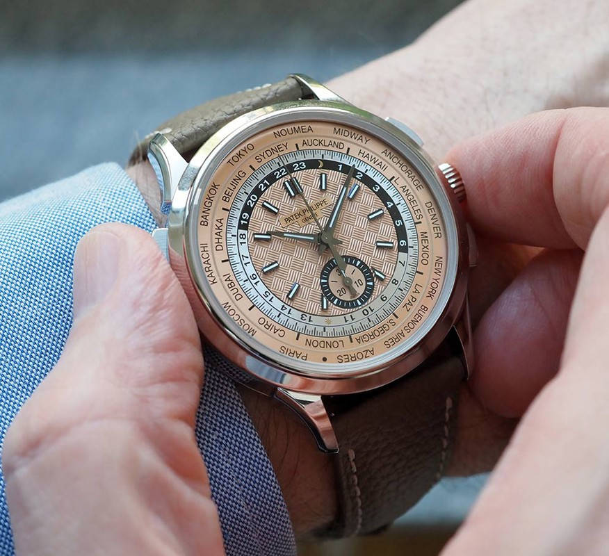 Хронограф реф. 5935A-001 с автоматическим подзаводом World Time flyback – первая версия культового хронографа, выполненная из нержавеющей стали. Часы выделяются своим спортивно-винтажным стилем. Узор Сarbon в центре опалово-розового позолоченного циферблата воплощает современный, динамичный дух. Функция мирового времени показывает время в 24 часовых поясах одновременно. Часы функционируют на основе эксклюзивного запатентованного механизма с возможностью коррекции показателей всех дисплеев при нажатии на кнопку в положении «10 часов». Модель представлена в версии с двумя ремешками из телячьей кожи: зернистым серо-коричневого цвета и бежевым с отделкой из нубука.