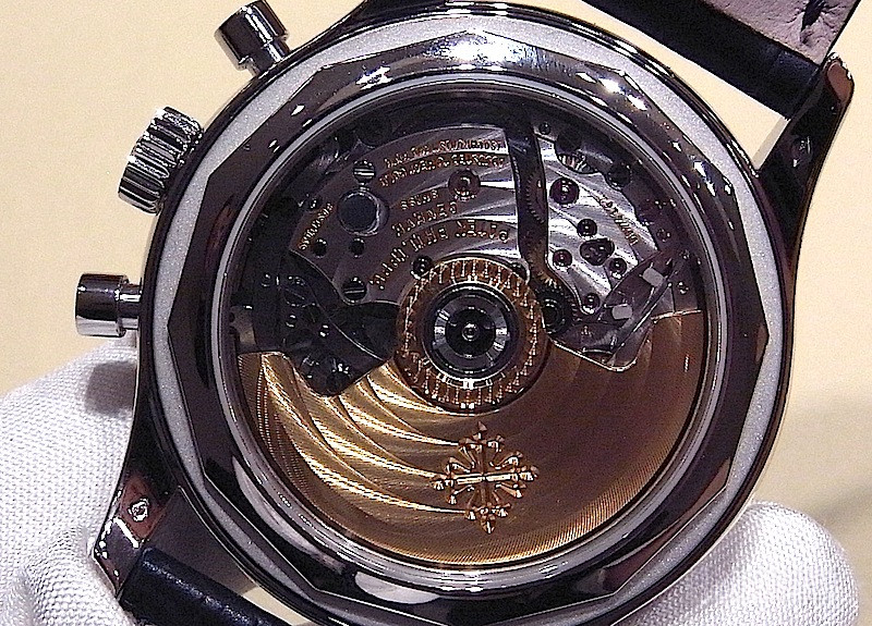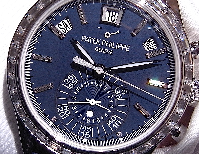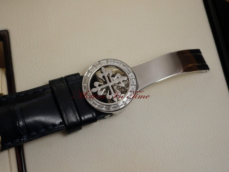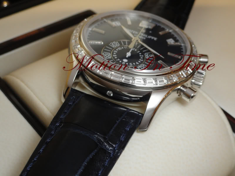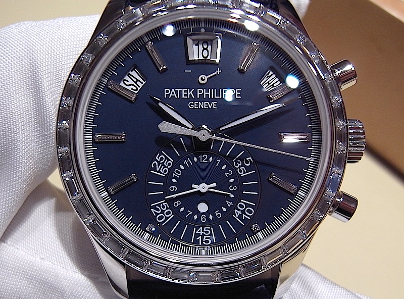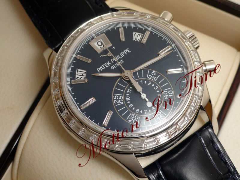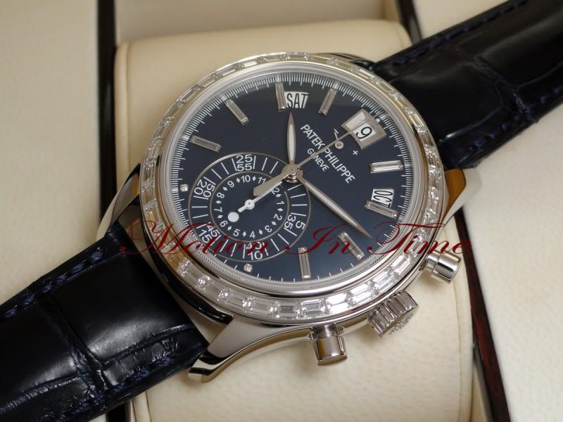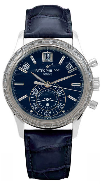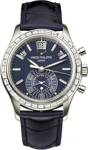 Часы Patek Philippe Complications 5961 5961P-001 с хронографом и годовым календарем выпущены в круглом корпусе из 950 платины. Размер составляет 40,5 мм, водонепроницаемость до 30 м, с безелем из 36-и белых багетных бриллиантов 3.48 ct. Внутри корпуса установлен автоматический механизм, Калибр CH 28-520 IRM QA 24H, обеспечивающий запас хода 55 часов. На синем циферблате с 8-ю белыми багетными бриллиантами 0.23 ct. отображаются часы, минуты, дата, день недели, месяц, запас хода, указатель день/ночь. Часы комплектуются ремешком из кожи аллигатора с платиновой вставкой, инкрустированной 22-мя белыми багетными бриллиантами 0.97 ct. и откидной застежкой.