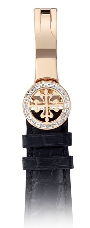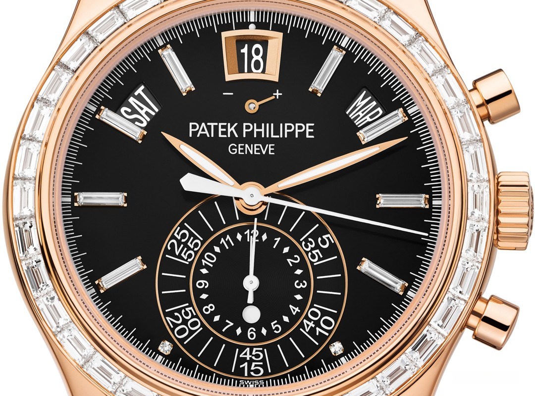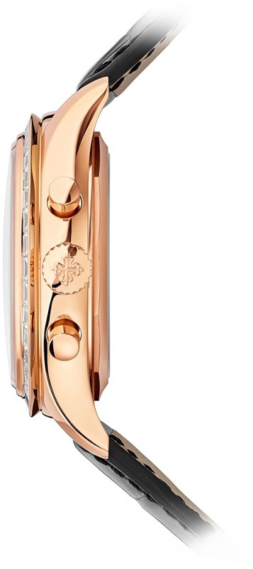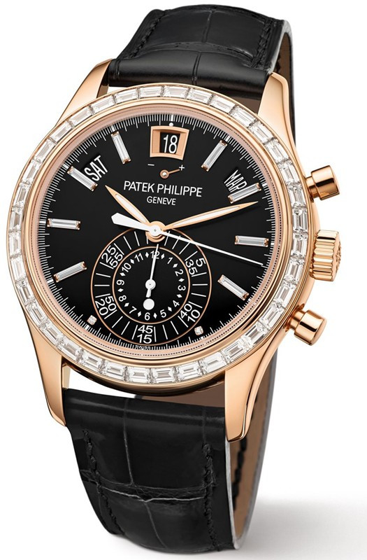 Часы Patek Philippe Complications 5961 5961R-010 с хронографом и годовым календарем выпущены в круглом корпусе из розового золота 18к. Размер составляет 40,5 мм, водонепроницаемость до 30 м, с безелем из 36-и белых багетных бриллиантов 3.48 ct. Внутри корпуса установлен автоматический механизм, Калибр CH 28-520 IRM QA 24H, обеспечивающий запас хода 55 часов. На черном циферблате с 8-ю белыми багетными бриллиантами 0.23 ct. отображаются часы, минуты, дата, день недели, месяц, запас хода, указатель день/ночь. Часы комплектуются ремешком из кожи аллигатора с вставкой из розового золота 18к, инкрустированной 22-мя белыми багетными бриллиантами 0.97 ct. и откидной застежкой.