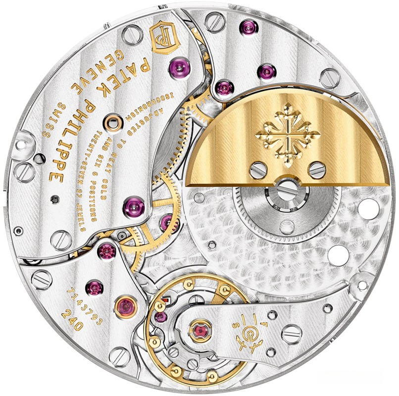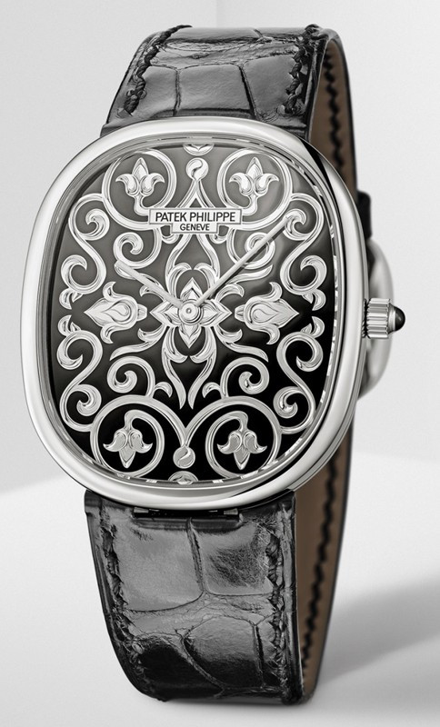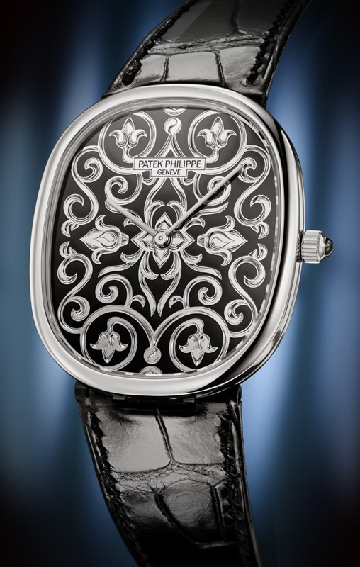 Вневременной дизайн Golden Ellipse сочетается с редкими ремеслами в новых часах из белого золота с очень оригинальным циферблатом. Сначала на пластине циферблата из золота 18 карат делаются углубления с использованием техники выемчатой эмали для дальнейшего нанесения черной эмали Grand Feu. На золотых участках, оставленных в рельефе, вручную гравируется узор в виде арабесок и завитков. Под этим искусно выполненным циферблатом скрывается ультратонкий калибр 240 с автоматическим заводом.