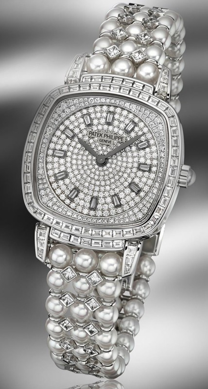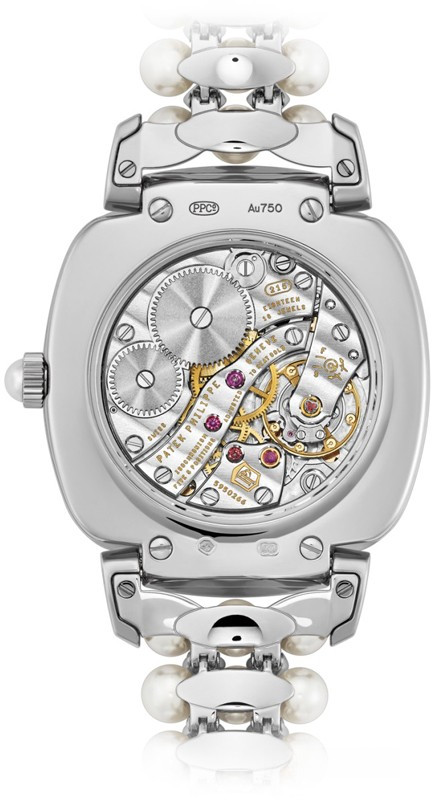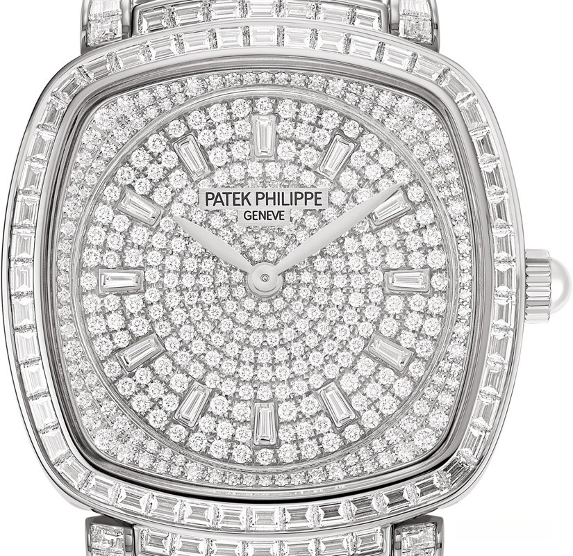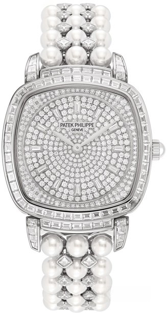 Новая модель Ladies Gondolo 7042 от швейцарского часового бренда Patek Philippe имеет корпус бочкообразной формы, изготовленный из белого золота 18к, длиной 34,8 мм, шириной 31 мм, водонепроницаемый до 30 метров. Сапфировое стекло установлено на передней стороне корпуса и на его задней крышке. Циферблат из 251 белого бриллианта весом 0.73 ct. с 12-ю белыми багетными бриллиантами весом 0.14 ct. в виде часовых маркеров. Безель и ушки корпуса инкрустированы 78-ю белыми багетными бриллиантами весом 2.33 ct. Заводная головка инкрустирована белым жемчугом кабошоном. Браслет из белого золота 18к, белого жемчуга Akoya и 52-х белых бриллиантов огранки «принцесса» весом 2.47 ct. Модель оснащена мануфактурным швейцарским механизмом с ручным заводом Patek Philippe 215, с, запасом хода 44 часа, функциями индикации часов и минут (посредством соответствующих центральных стрелок).