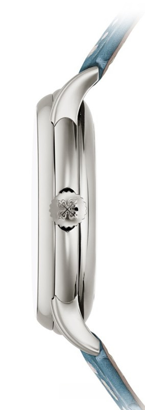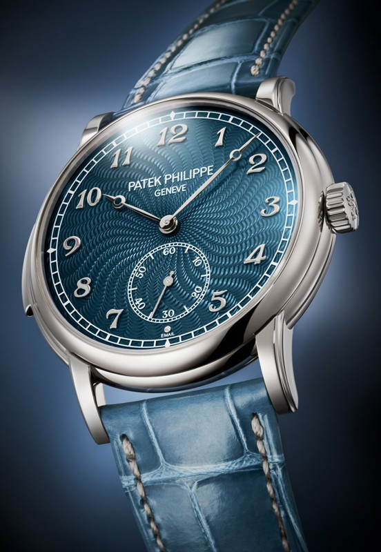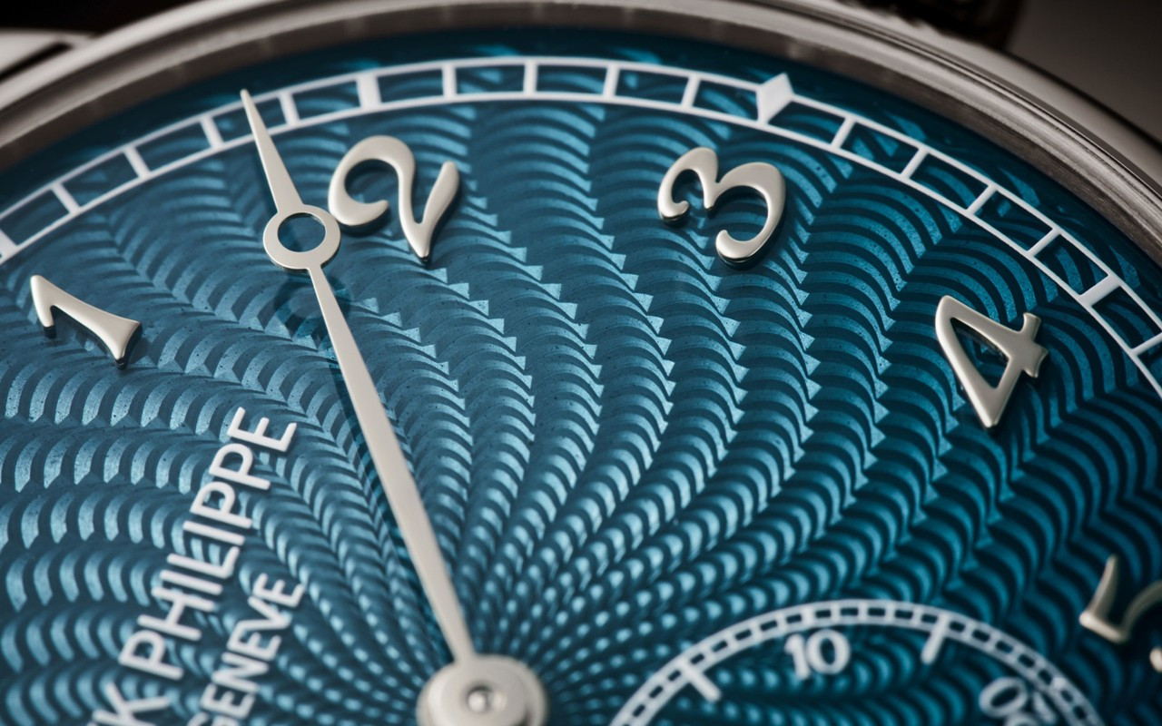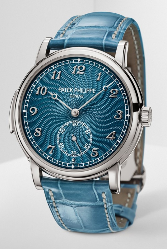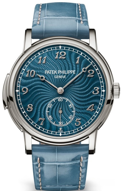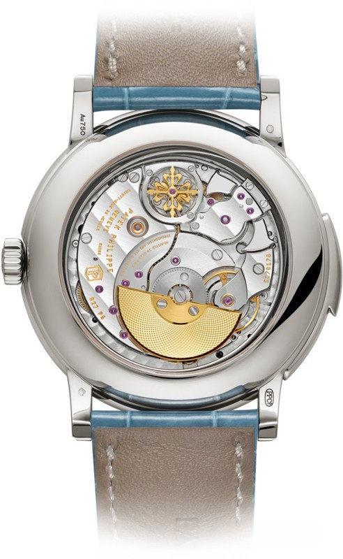 Часы Patek Philippe Grand Complication с минутным репетиром изготовлены из белого золота 18к. Размер корпуса составляет 40 мм. Часы защищены от попадания пыли и влаги, но не являются водонепроницаемыми. Циферблат часов синий. Индикация времени осуществляется посредством центральных часовой и минутной стрелок, а также маленькой секундной стрелки на 6-ти часах. Внутри корпуса установлен мануфактурный автоматический Калибр с функцией минутного репетира R 27 PS. Часы комплектуются синим ремешком из кожи аллигатора с золотой застежкой.