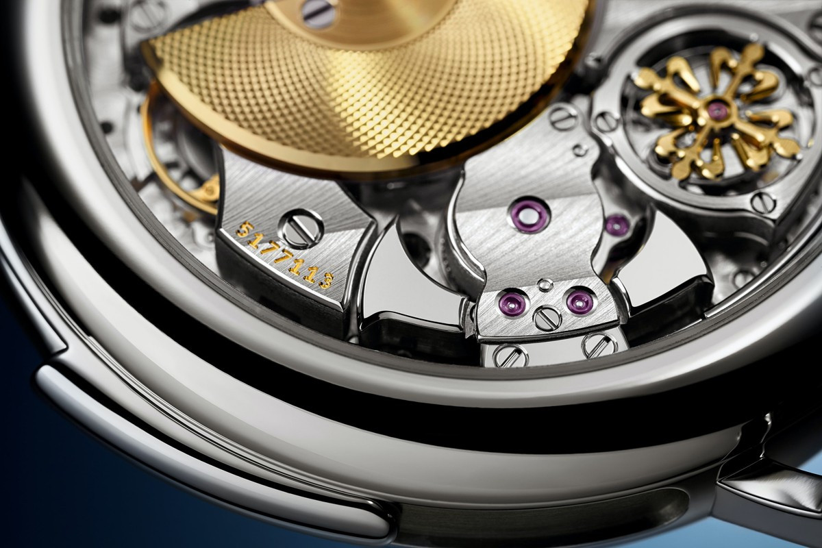 Часы 5374G-001: минутный репетир, бой с двумя «кафедральными» гонгами приводится в действие расположенным на корпусе переводным рычагом; вечный календарь - индикация дня недели, даты, месяца, цикла високосных лет с помощью стрелок, индикаторы фаз Луны и времени суток. Синий эмалевый циферблат, накладные брегетные золотые цифры. Циферблат из золота 18 карат. Прошитый вручную ремешок из блестящей кожи аллигатора с квадратным узором, раскладывающаяся застежка. Сменные задние крышки из металла и сапфирового стекла. Неводостойкий корпус обеспечивает защиту только от проникновения влаги и пыли. Корпус диаметром 42 мм изготовлен из белого золота 18к. Механизм с автоматическим заводом, Калибр R 27 Q, обладает запасом хода 48 часов.