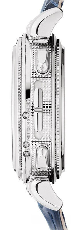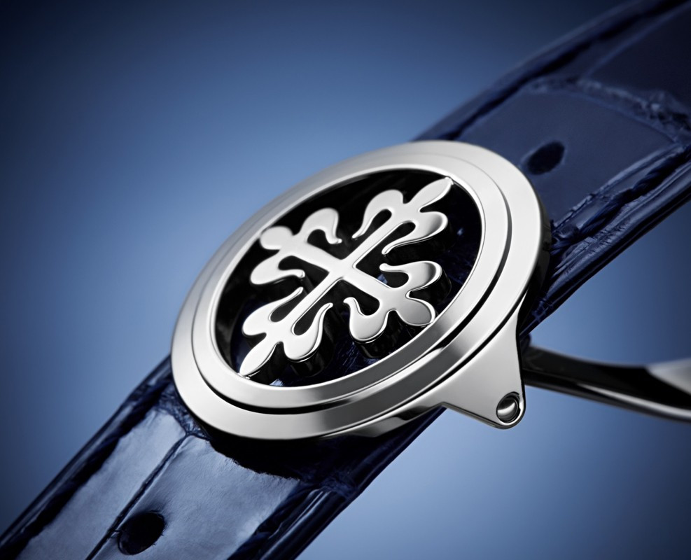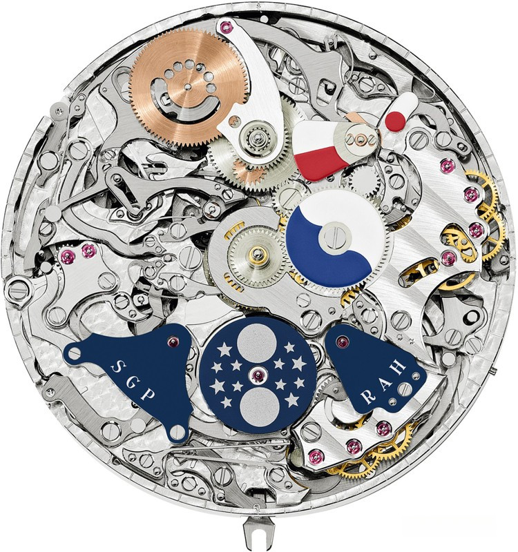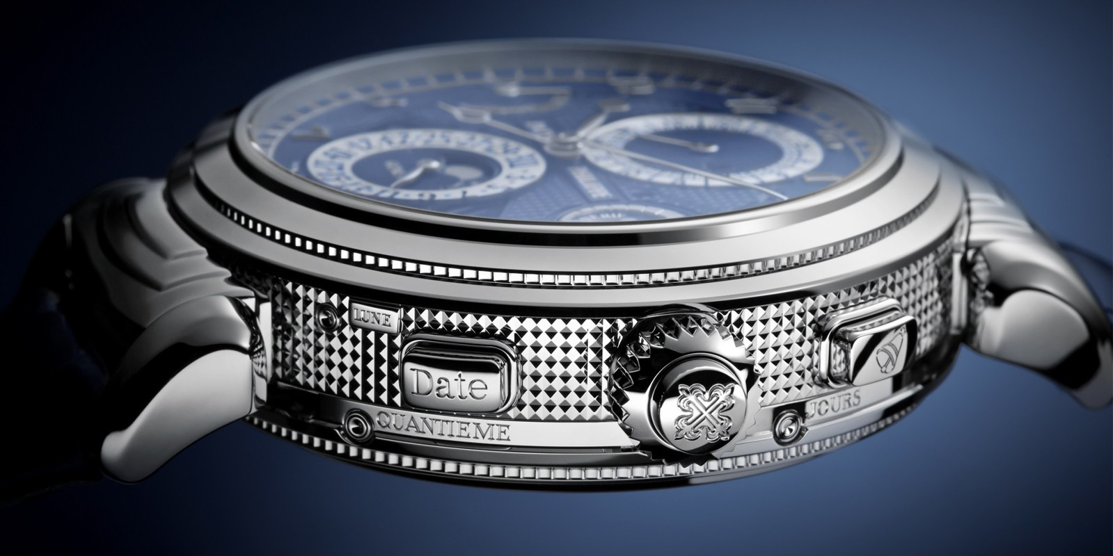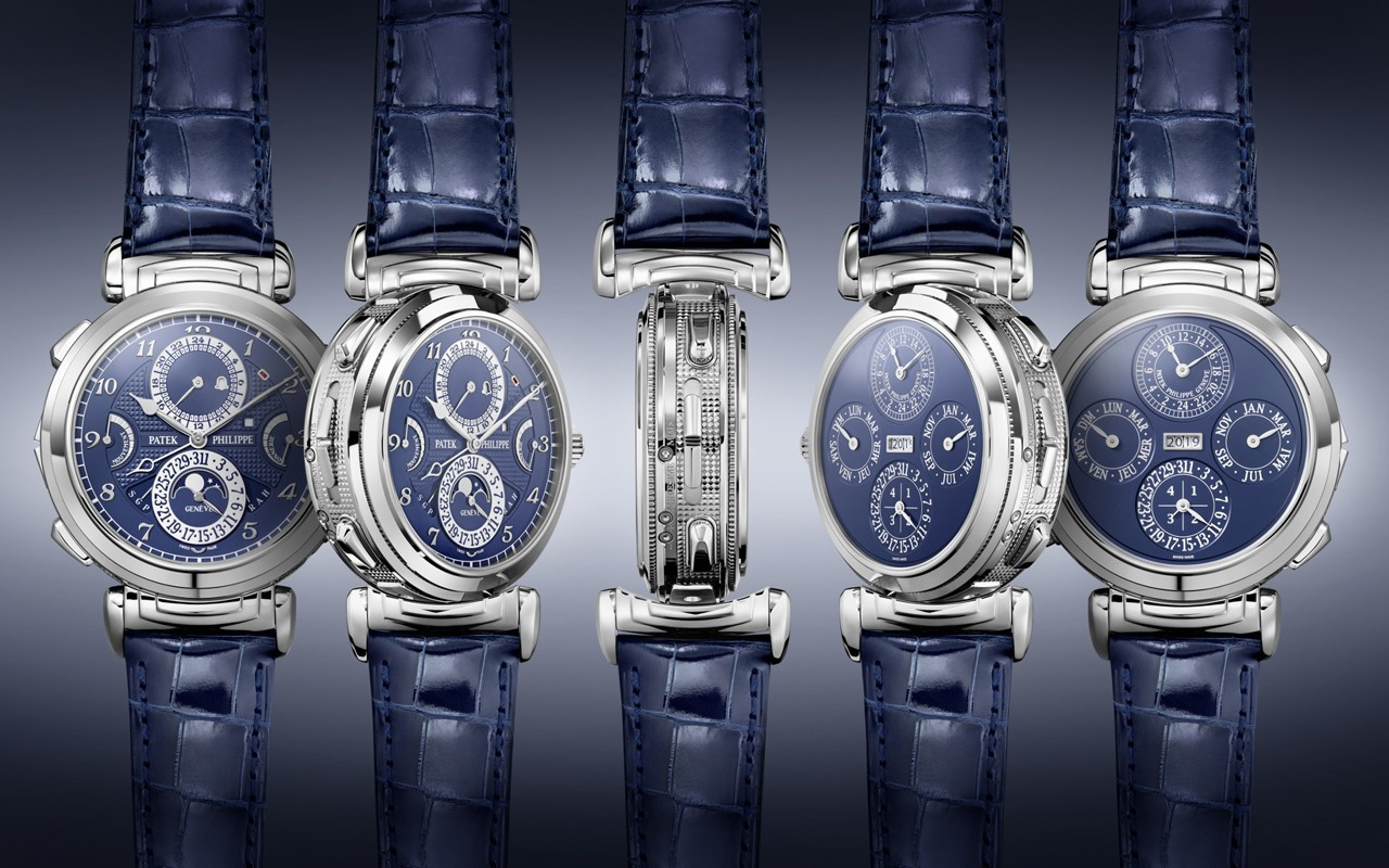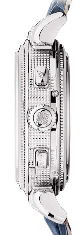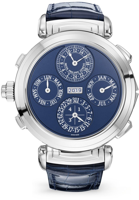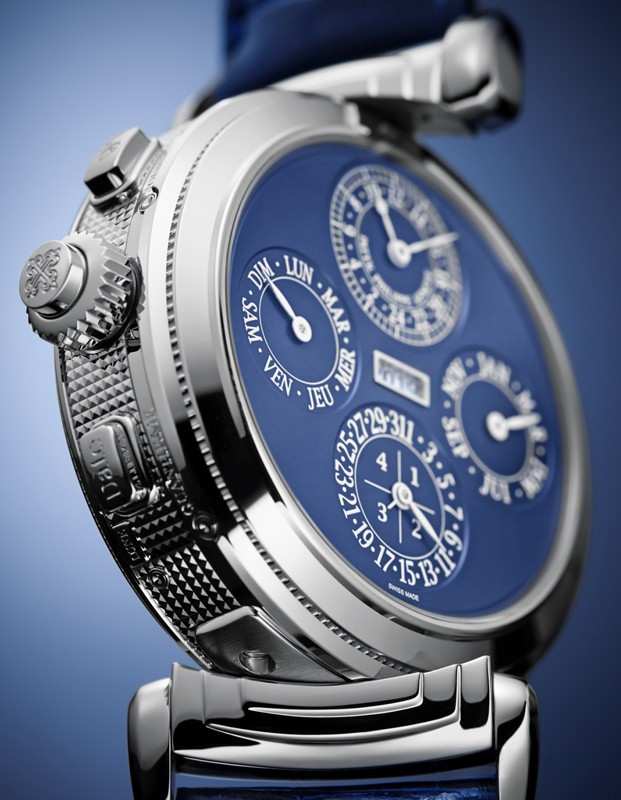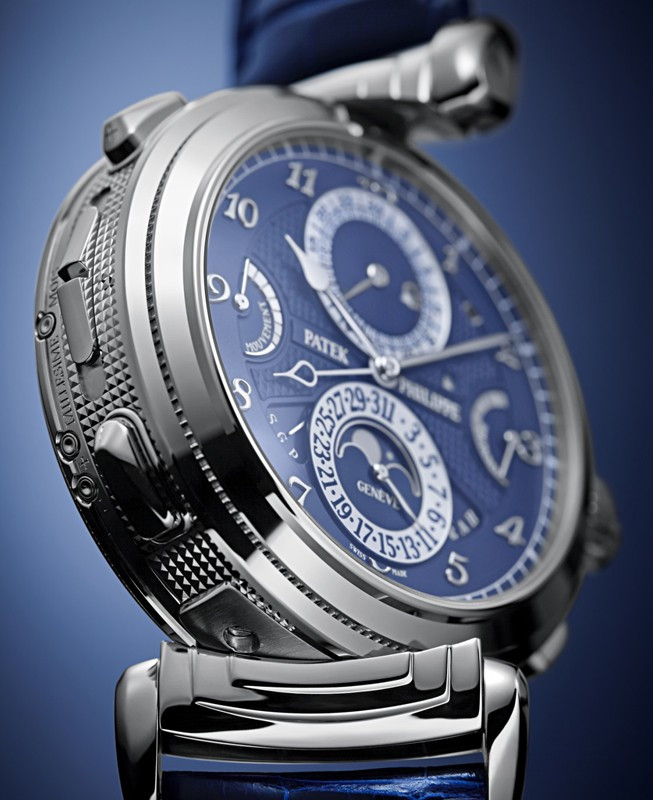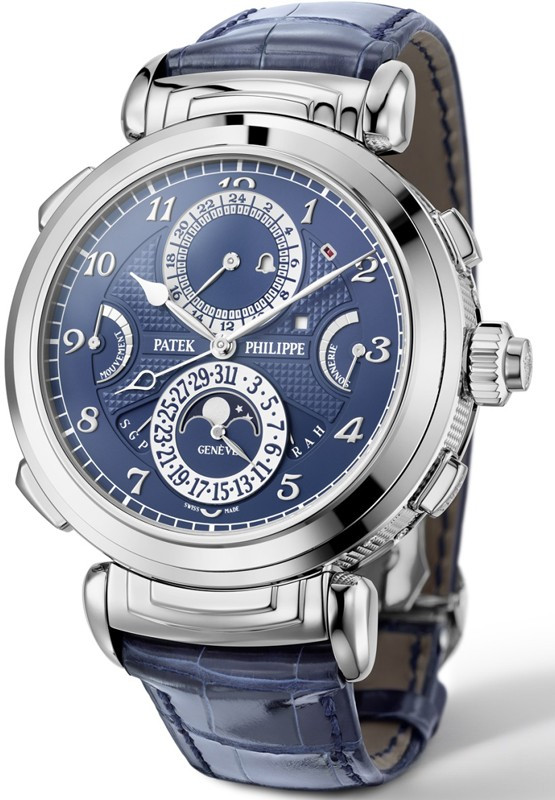 Самые сложные наручные часы Patek Philippe предлагаются в новой, ставшей эталоном совершенства и элегантности версии из белого золота с синими опаловыми циферблатами. Переворачивающийся корпус с запатентованным поворотным устройством украшен гильошированным вручную узором «Парижские гвозди». К двадцати сложным функциям часов относятся пять режимов работы механизма боя, два из которых запатентованы и не имеют аналогов: будильник с боем и по требованию отбивающий дату репетир даты. Механизм с ручным заводом. Калибр 300 GS AL 36-750 QIS FUS IRM. Индикатор отключения механизма боя. Указатель времени второго часового пояса. Указатель времени второго часового пояса с индикатором времени суток. Индикация дня недели, даты (на обоих циферблатах), месяца и цикла високосных лет с помощью стрелок. Четырехзначная индикация года в окошке. 24-часовой и минутный дополнительный циферблат. Индикатор положения заводной коронки (R/завод, A/настройка будильника, H/установка времени). Сторона индикации времени: синий опаловый, накладные брегетные цифры из золота, гильошированный вручную узор «Парижские гвозди» в центре. Сторона календаря: синий опаловый. Пластины циферблата из золота 18 карат. Корпус из белого золота 18к. Неводостойкий корпус обеспечивает защиту только от проникновения влаги и пыли. Диаметр: 47,7 мм. Высота: 16,07 мм. Ремешок прошитый вручную, блестящая кожа аллигатора темно-синего цвета с квадратным узором. Раскладывающаяся застежка.