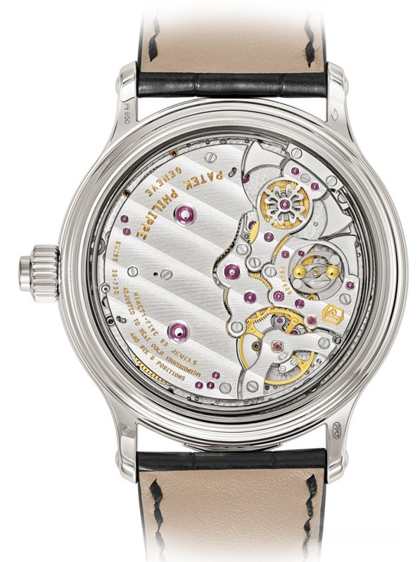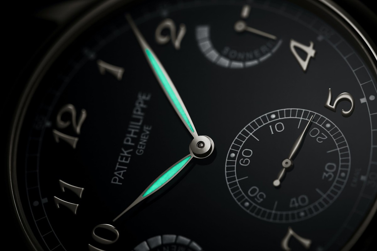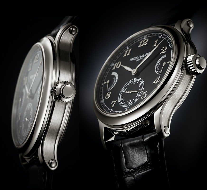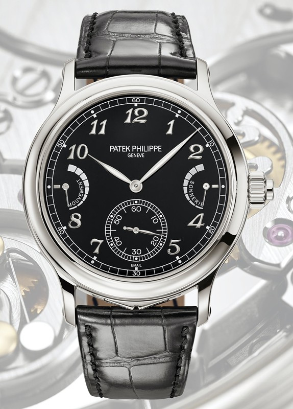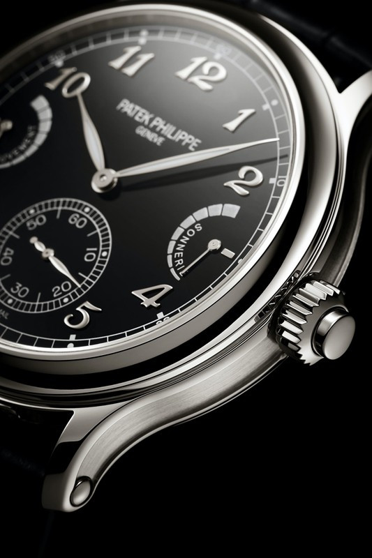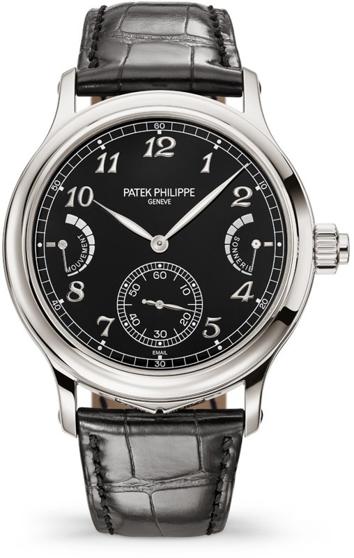 Patek Philippe еще раз подтверждает свое безупречное мастерство воспевания музыки времени с выпуском своих первых часов, которые сочетают в себе механизм большого боя – самую ценную из всех функций боя – с малым боем и минутным репетиром. Поклонники марки ждали выпуска этой модели в течение достаточно длительного времени. На новый механизм из 703 деталей, оснащенный тремя классическими гонгами, было оформлено сразу 2 патента: один на механизм боя, а второй – на прыгающую секундную стрелку. Механизм размещен в элегантном корпусе из платины с черным циферблатом, отделанным в технике горячей эмали. Механизм с ручным заводом. Калибр GS 36?750 PS IRM. Большой бой. Малый бой. Минутный репетир с 3 классическими гонгами. Прыгающая малая секундная стрелка. Индикатор запаса хода часового механизма. Индикатор запаса хода механизма боя. Черная эмаль Grand Feu с глянцевым эффектом, накладные брегетные золотые цифры. Циферблат из золота 18 карат. Платина. Сменные непрозрачные и выполненные из сапфирового стекла задние крышки. Неводостойкий корпус обеспечивает защиту только от проникновения влаги и пыли. Диаметр корпуса: 44.8 мм. Высота: 12 мм. Прошитый вручную, блестящая черная кожа аллигатора с квадратным узором. Раскладывающаяся застежка.