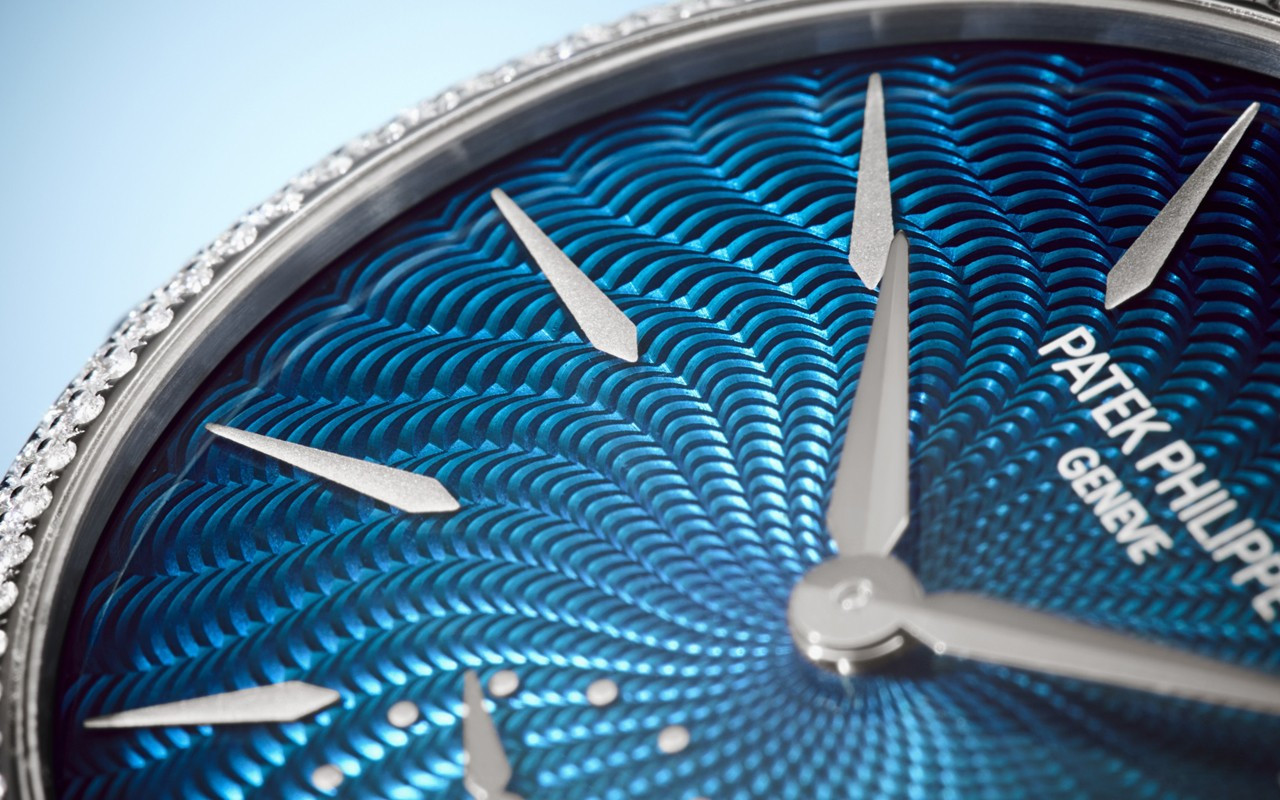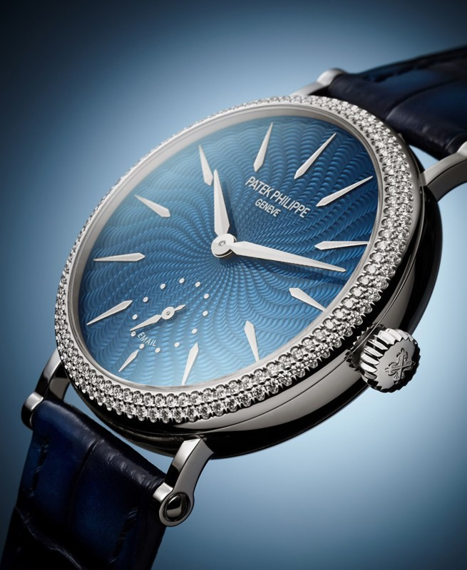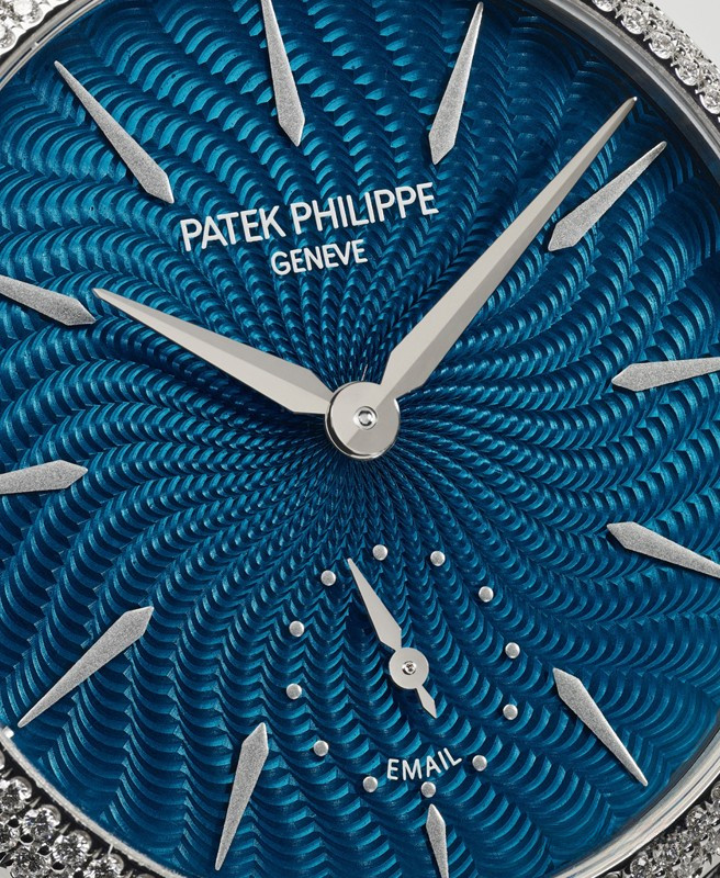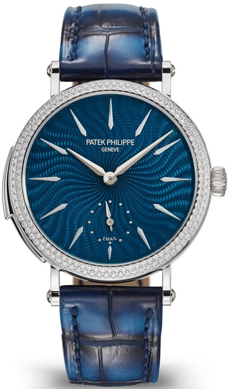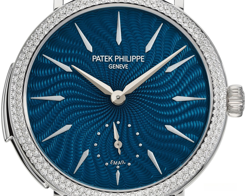 Patek Philippe представляет новый женский минутный репетир из белого золота с изысканной отделкой. Золотая пластина циферблата украшена гильошированным вручную узором в виде спиралей, а затем покрыта прозрачной синей эмалью, раскрывающей основной декор – редкую ремесленную технику, известную как эмаль flinqué. Безель украшен двойным рядом из 168 бриллиантов категории Top Wesselton Pure (~ 0,78 карата), закрепленных с помощью техники «Flamme®». Калибр с автоматическим заводом R 27 PS отличается мелодичным звучанием двух классических гонгов.