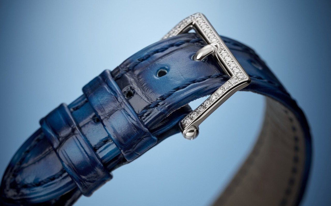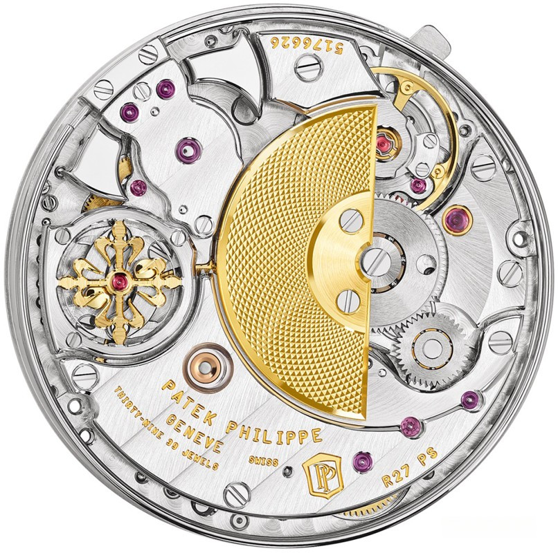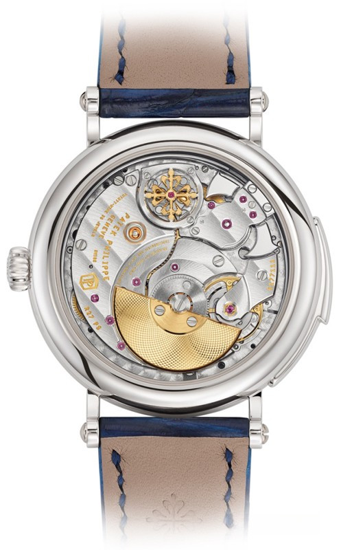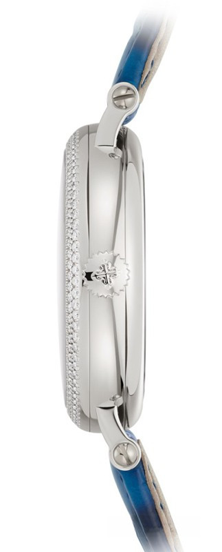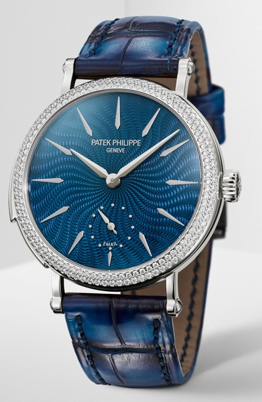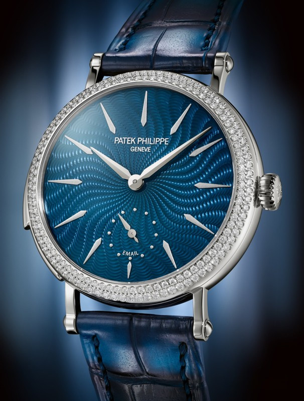 Patek Philippe представляет новый женский минутный репетир из белого золота с изысканной отделкой. Золотая пластина циферблата украшена гильошированным вручную узором в виде спиралей, а затем покрыта прозрачной синей эмалью, раскрывающей основной декор – редкую ремесленную технику, известную как эмаль flinqué. Безель украшен двойным рядом из 168 бриллиантов категории Top Wesselton Pure (~ 0,78 карата), закрепленных с помощью техники «Flamme®». Калибр с автоматическим заводом R 27 PS отличается мелодичным звучанием двух классических гонгов.