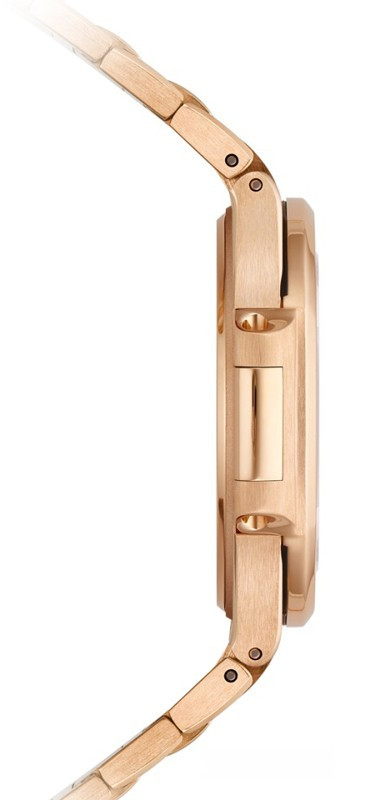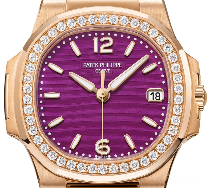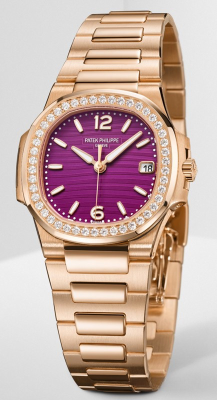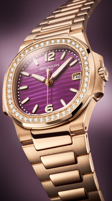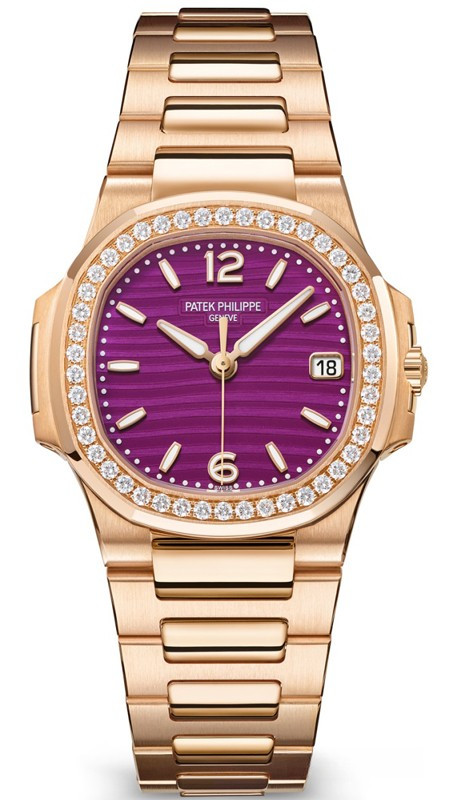 Часы Patek Philippe Nautilus Lady 7010R представлены в корпусе размером 32 х 6.9 мм из розового золота 18к водонепроницаемостью 30 метров. Внутри корпуса установлен кварцевый механизм, Калибр E 23?250 S C. На фиолетовом гильошированном циферблате отображаются часы, минуты, секунды, дата. Часы поставляются на золотом браслете. Безель из белых бриллиантов.