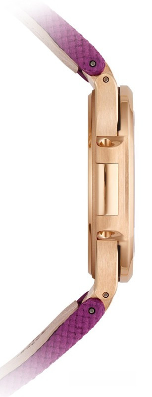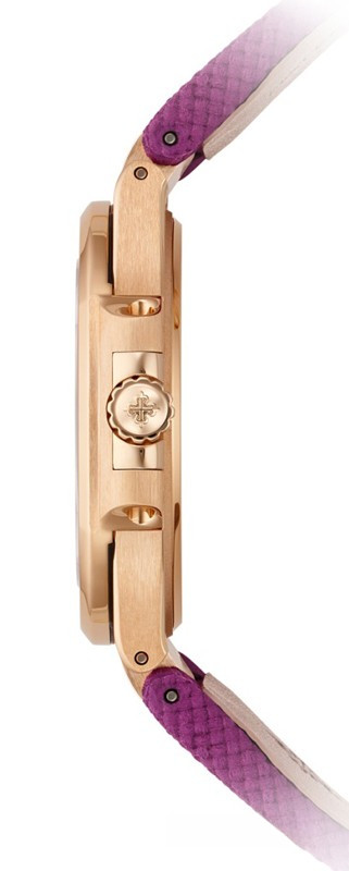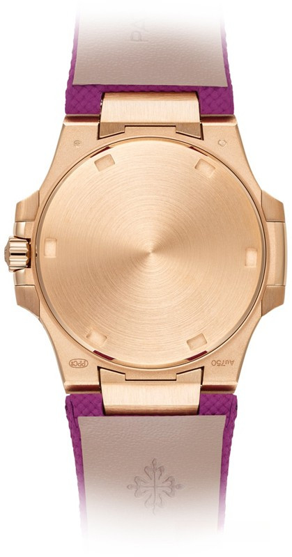 Часы Patek Philippe Nautilus Lady 7010R представлены в корпусе размером 32 х 6.9 мм из розового золота 18к водонепроницаемостью 30 метров. Внутри корпуса установлен кварцевый механизм, Калибр E 23?250 S C. На фиолетовом гильошированном циферблате отображаются часы, минуты, секунды, дата. Часы поставляются на каучуковом ремешке с золотой застежкой. Безель из белых бриллиантов.