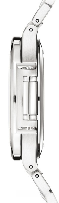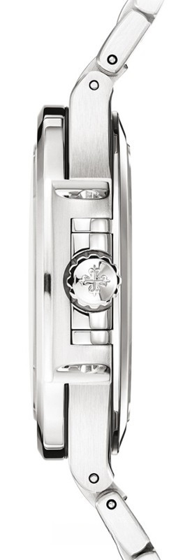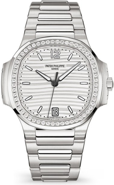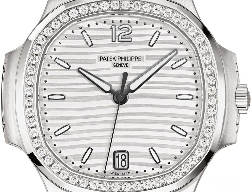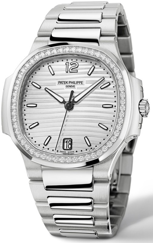 Автоматические женские часы Nautilus из стали с украшенным бриллиантами безелем теперь предлагаются в еще более выразительном исполнении: диаметр корпуса был увеличен с 33,6 мм до 35,2 мм. Преображения затронули и цветовую гамму циферблатов, которая пополнилась синим опаловым, серебристым опаловым и серым опаловым оттенками к внешнему краю, плавно переходящими в черный цвет. Стальной браслет оснащен раскладывающейся застежкой с новой системой подгонки размера, позволяющей для оптимального комфорта изменять длину браслета на 2–4 мм. Механизм с автоматическим заводом. Калибр 324 S C. Индикация даты в окошке. Центральная секундная стрелка. Синий опаловый циферблат, накладные золотые часовые метки и цифры с люминесцентным покрытием. Корпус из нержавеющей стали. Задняя крышка из сапфирового стекла. Водонепроницаемость до 60 метров. Диаметр корпуса (по диагонали «10 часов» – «4 часа»): 35,2 мм. Высота: 8.62 мм. Безель из 56 бриллиантов общим весом ~0,67 карата. Стальной браслет. Раскладывающаяся застежка Nautilus.