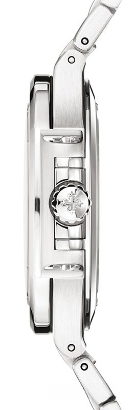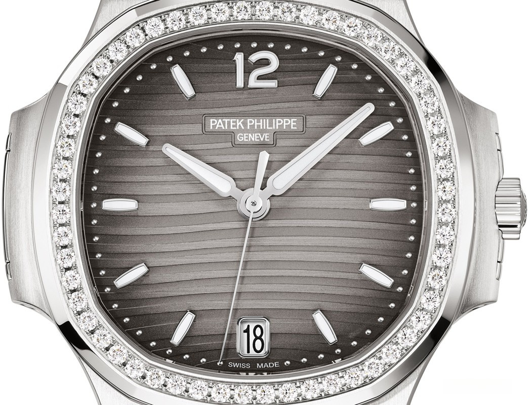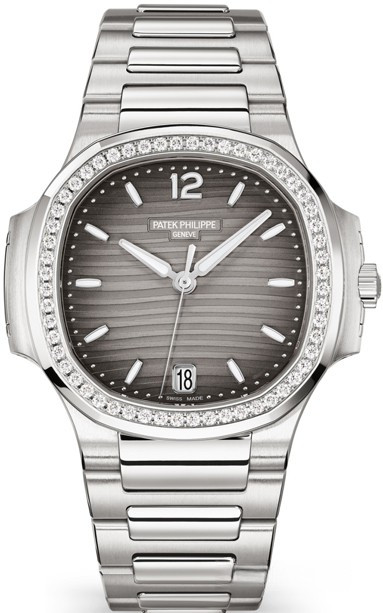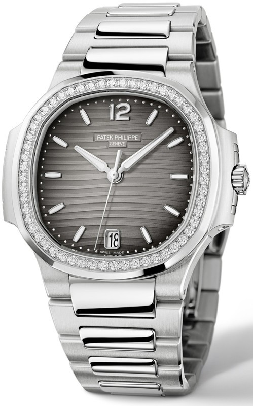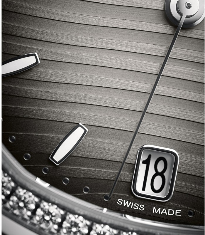 Автоматические женские часы Nautilus из стали с украшенным бриллиантами безелем теперь предлагаются в еще более выразительном исполнении: диаметр корпуса был увеличен с 33,6 мм до 35,2 мм. Преображения затронули и цветовую гамму циферблатов, которая пополнилась синим опаловым, серебристым опаловым и серым опаловым оттенками к внешнему краю, плавно переходящими в черный цвет. Стальной браслет оснащен раскладывающейся застежкой с новой системой подгонки размера, позволяющей для оптимального комфорта изменять длину браслета на 2–4 мм. Механизм с автоматическим заводом. Калибр 324 S C. Индикация даты в окошке. Центральная секундная стрелка. Синий опаловый циферблат, накладные золотые часовые метки и цифры с люминесцентным покрытием. Корпус из нержавеющей стали. Задняя крышка из сапфирового стекла. Водонепроницаемость до 60 метров. Диаметр корпуса (по диагонали «10 часов» – «4 часа»): 35,2 мм. Высота: 8.62 мм. Безель из 56 бриллиантов общим весом ~0,67 карата. Стальной браслет. Раскладывающаяся застежка Nautilus.