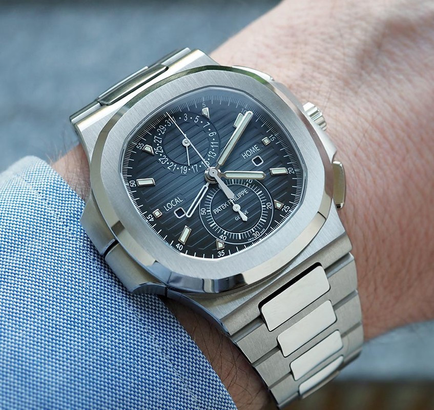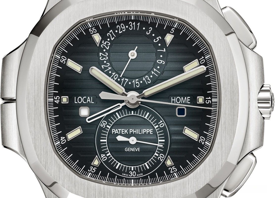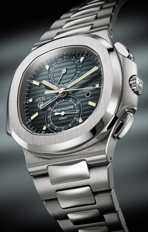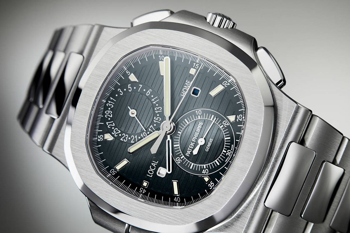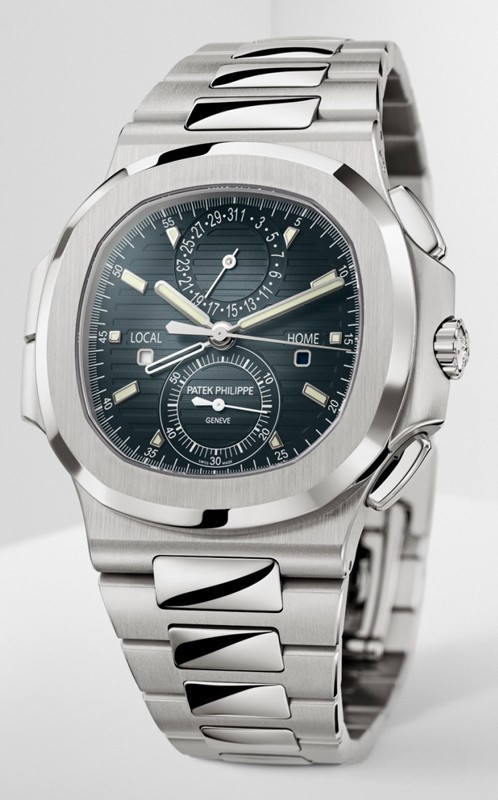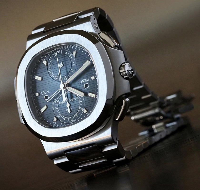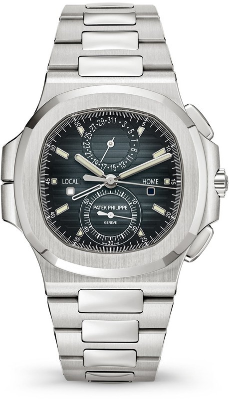 Хронограф мод. 5990/1A-011 Nautilus Travel Time - редкие часы Patek Philippe из стали. Он оснащен новым циферблатом синего цвета с узором «солнечные лучи» и нежным черным деграде по периферии. Механизм с автоматическим подзаводом CH 28-520 C FUS сочетает в себе три практичные сложные функции: flyback, Travel Time (индикация двух часовых поясов двумя отдельными часовыми стрелками; скелетонизированная стрелка показывает домашнее время) и аналоговую дату в положении «12 часов», которая синхронизируется с местным временем.